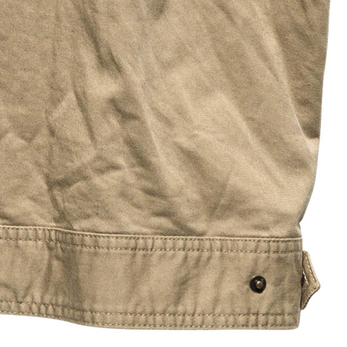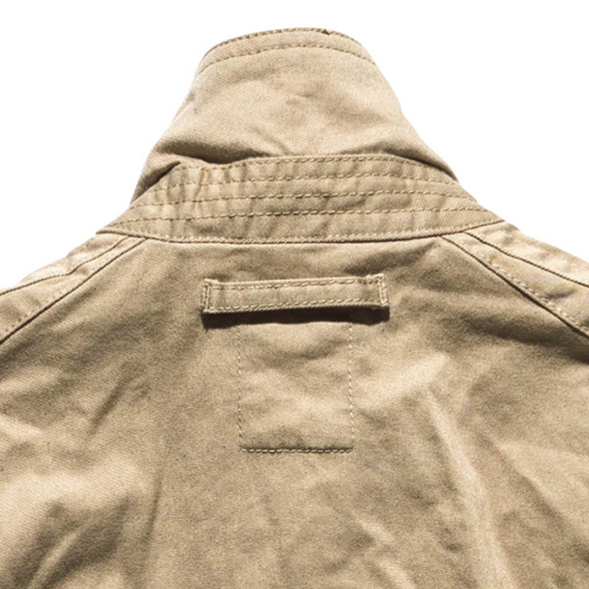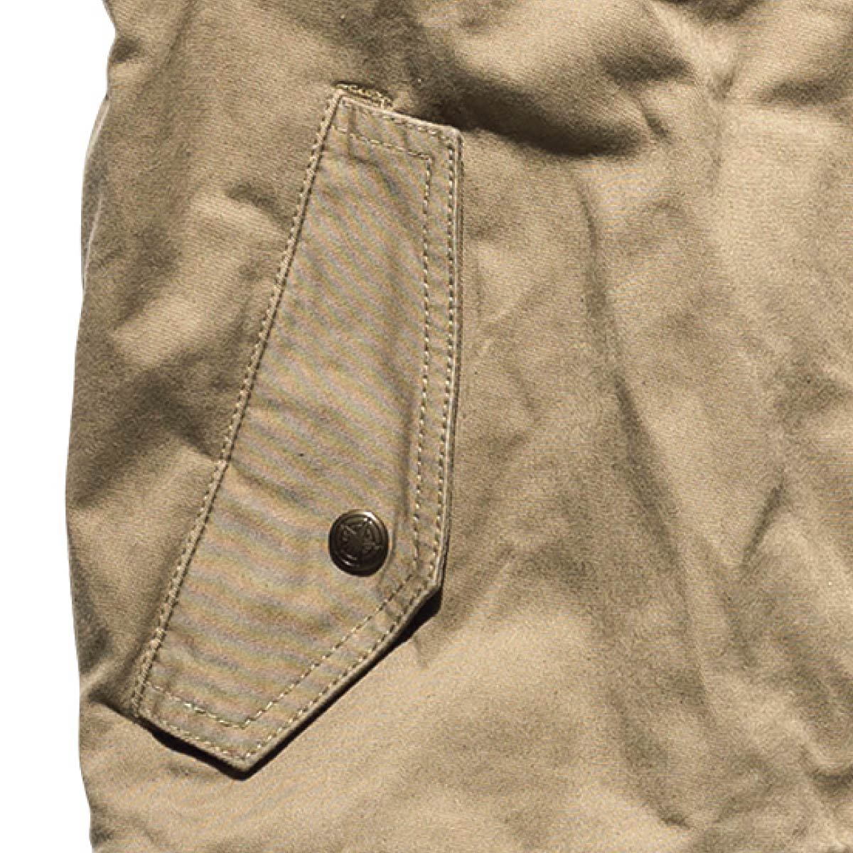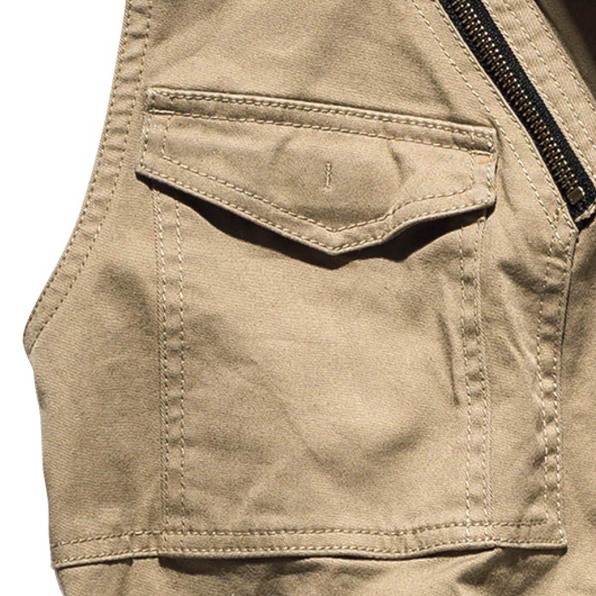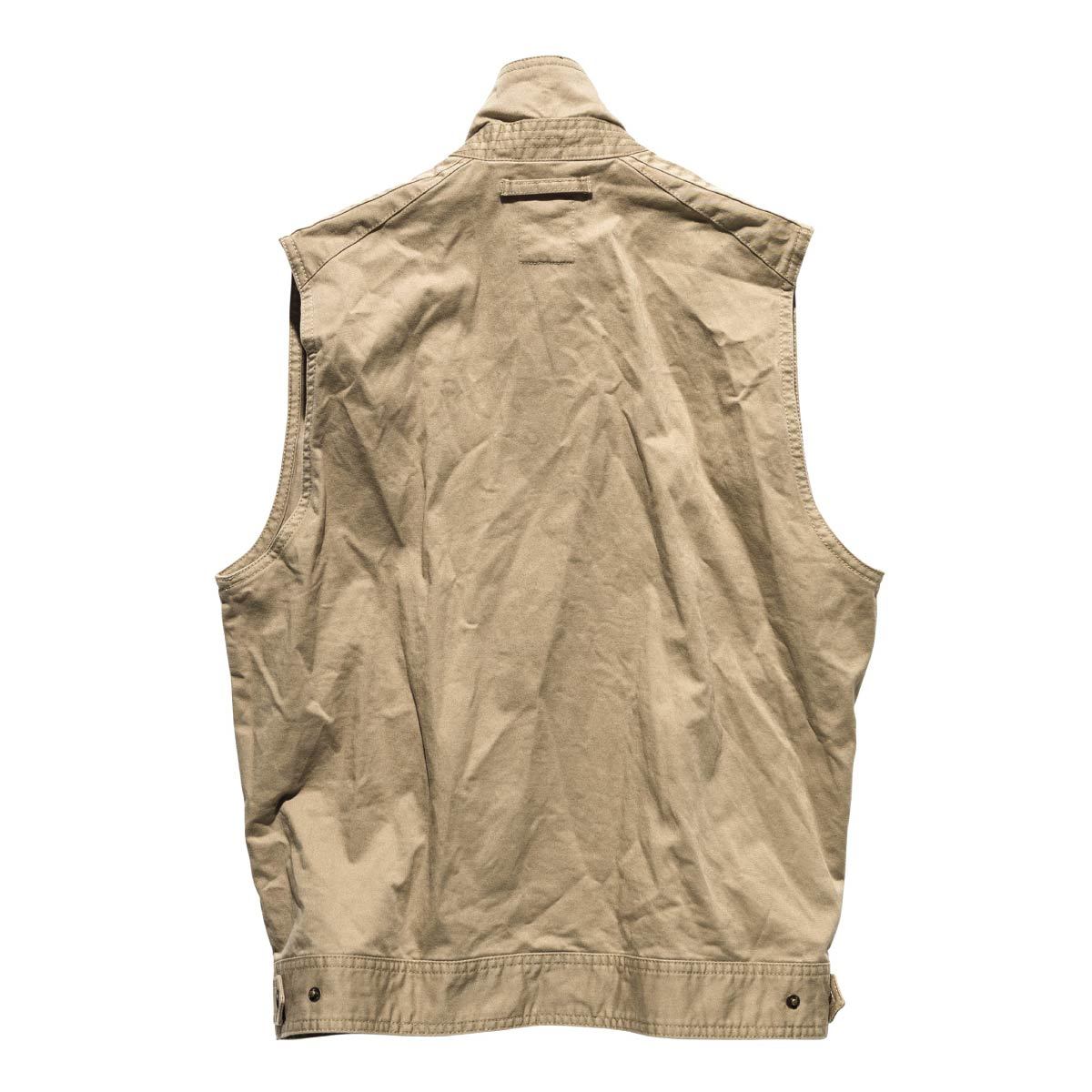 スタイリッシュなフライトジャケットと同じデザインのツイルベスト、すっきりとしたライン、ファスナー使いとポケットのカッティング、エポレットイメージのディテールなどハードなイメージをポイントに見た目だけではなく、ノーフォークやマチを一体にしたパターンが機能ポイント。