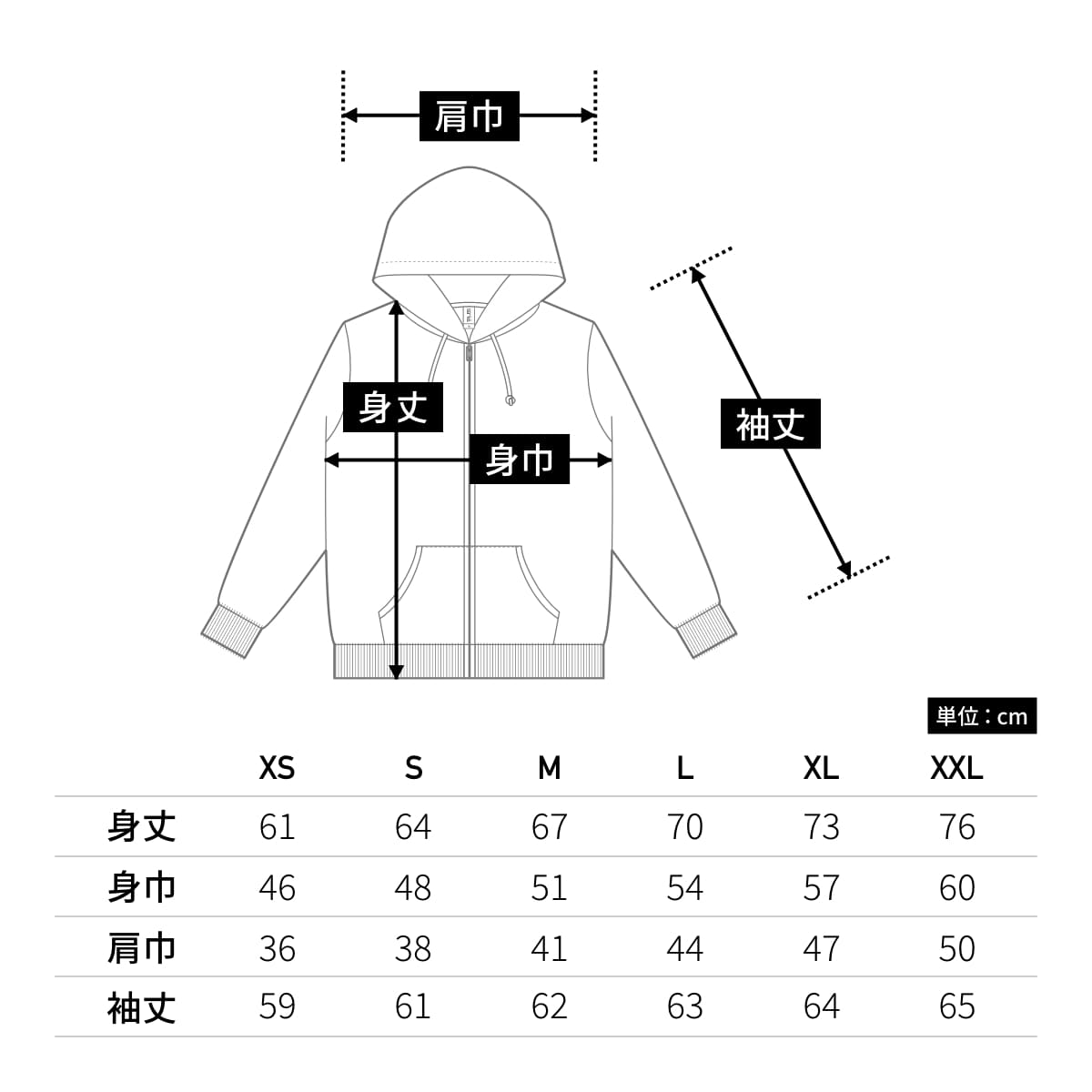 | 身丈 | 61 | 64 | 67 | 70 | 73 | 76 |