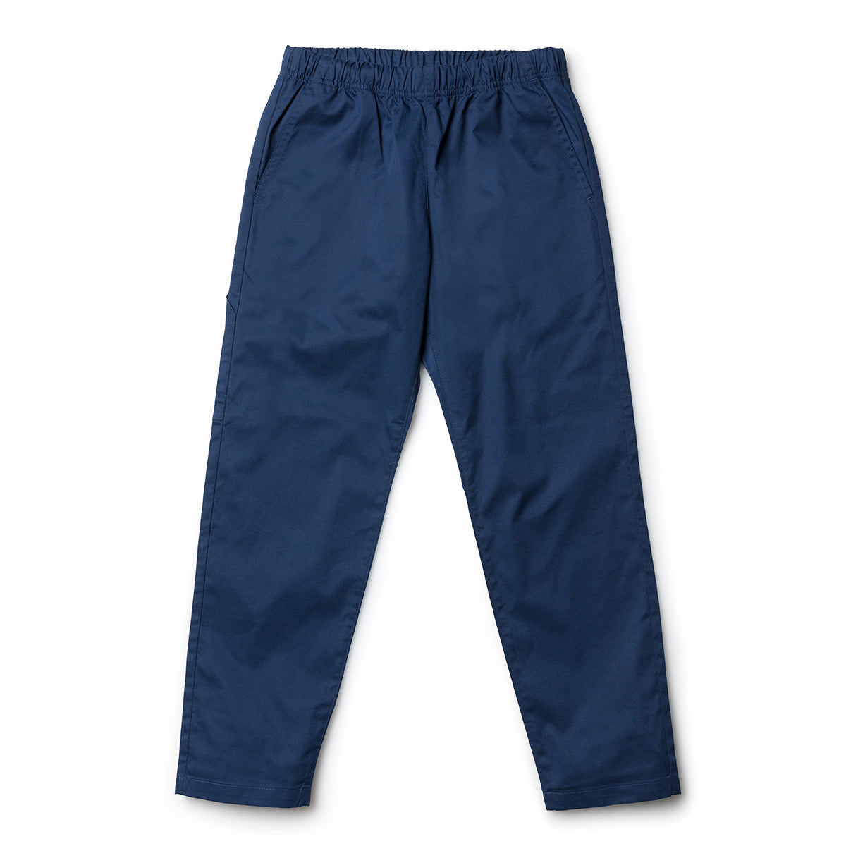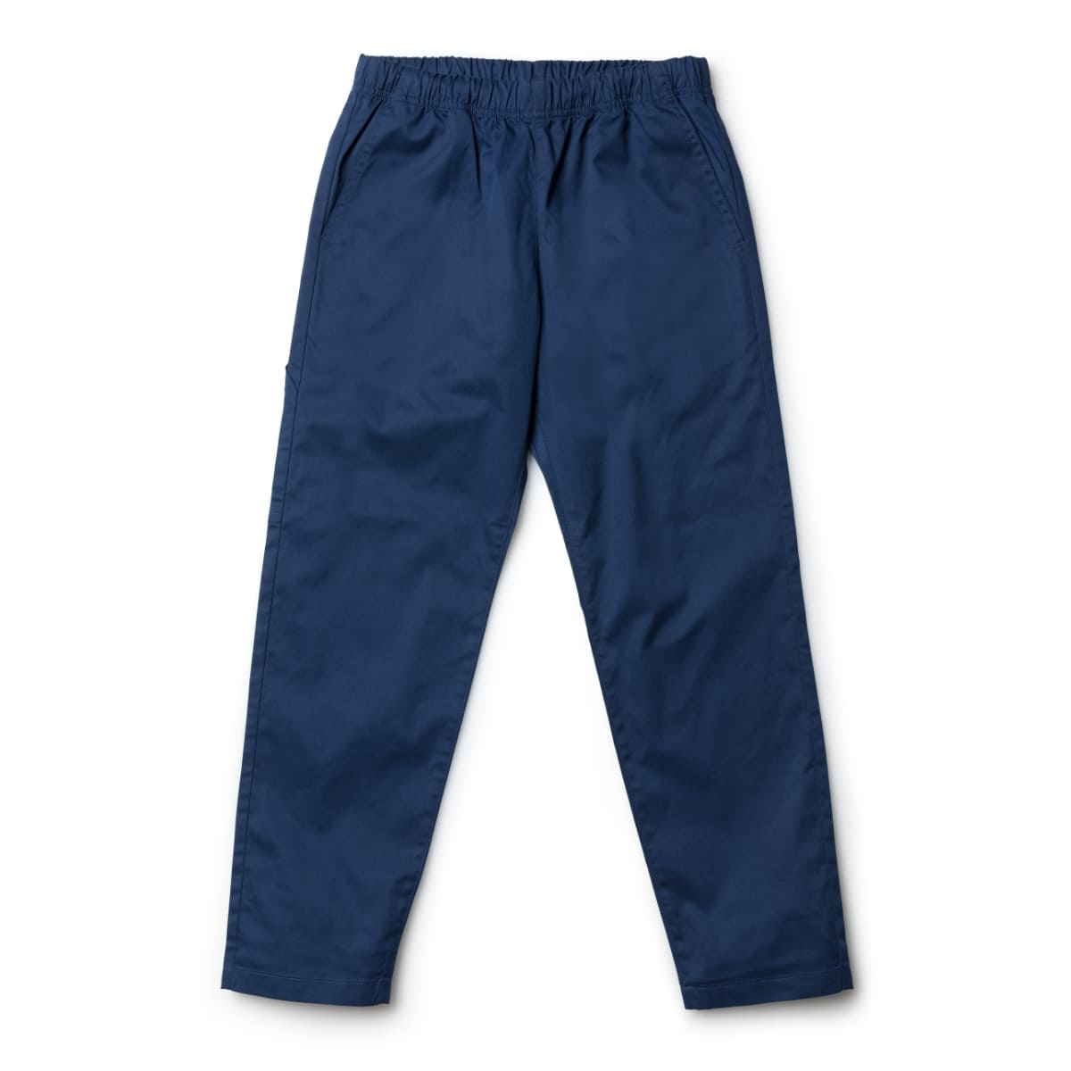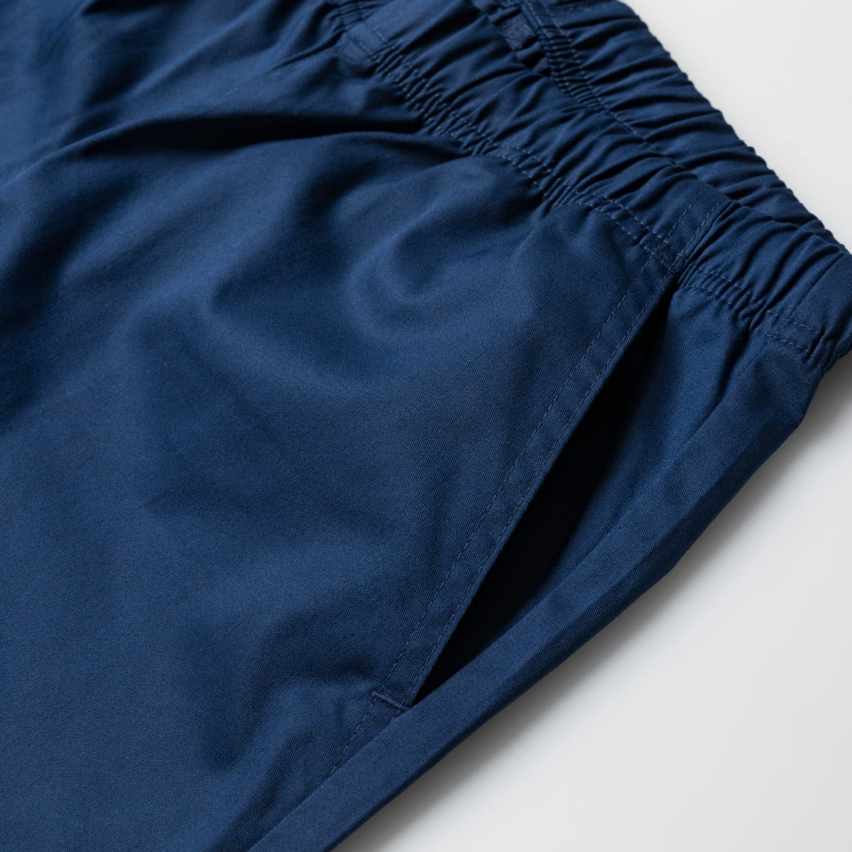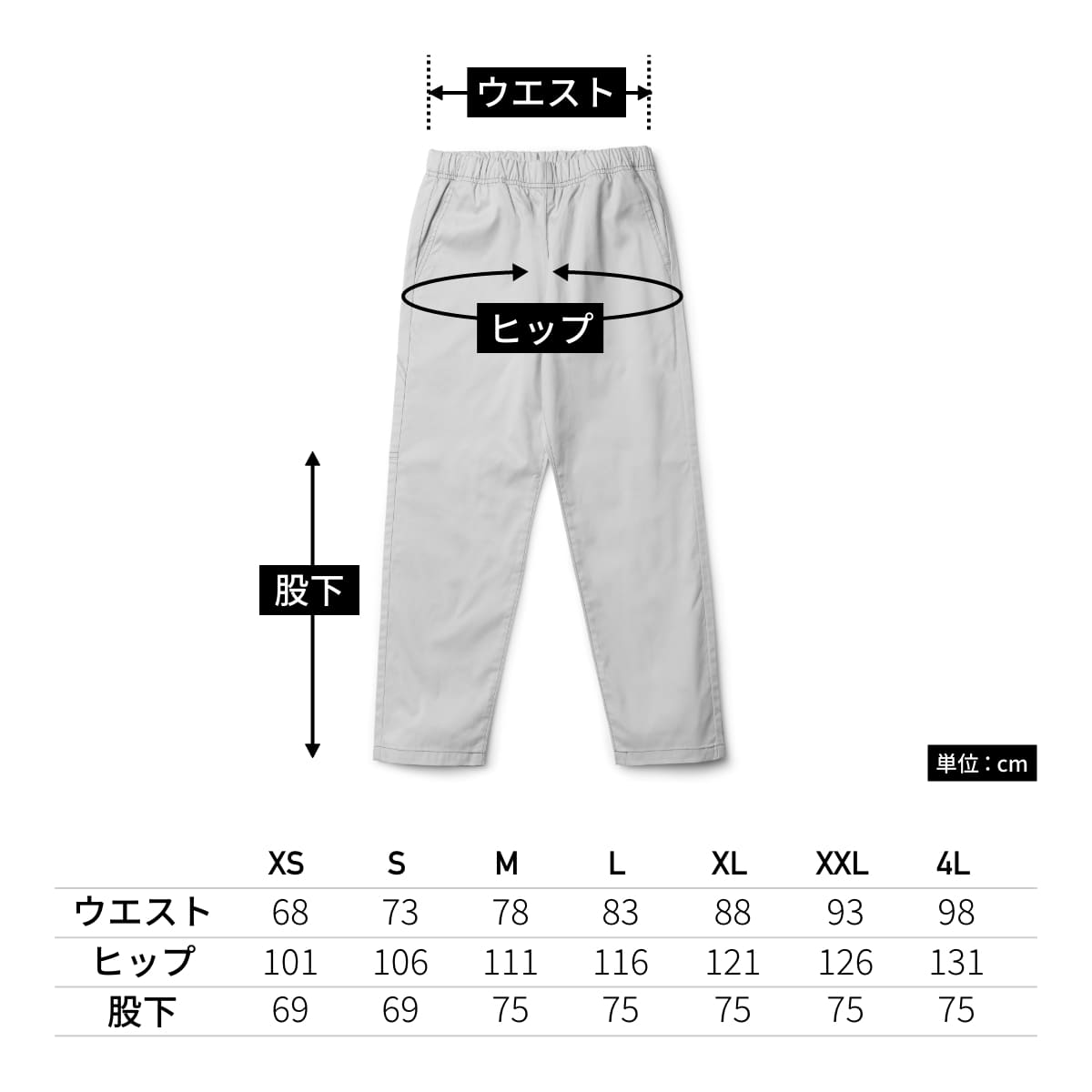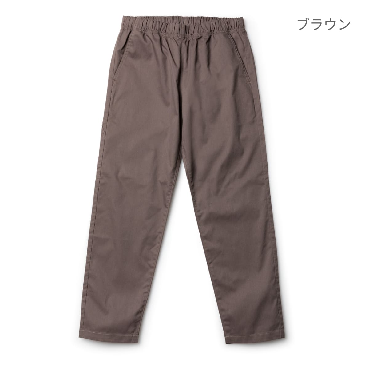 ウエストゴム、コード仕立てで屈伸時も動きやすいユニセックスパンツ。