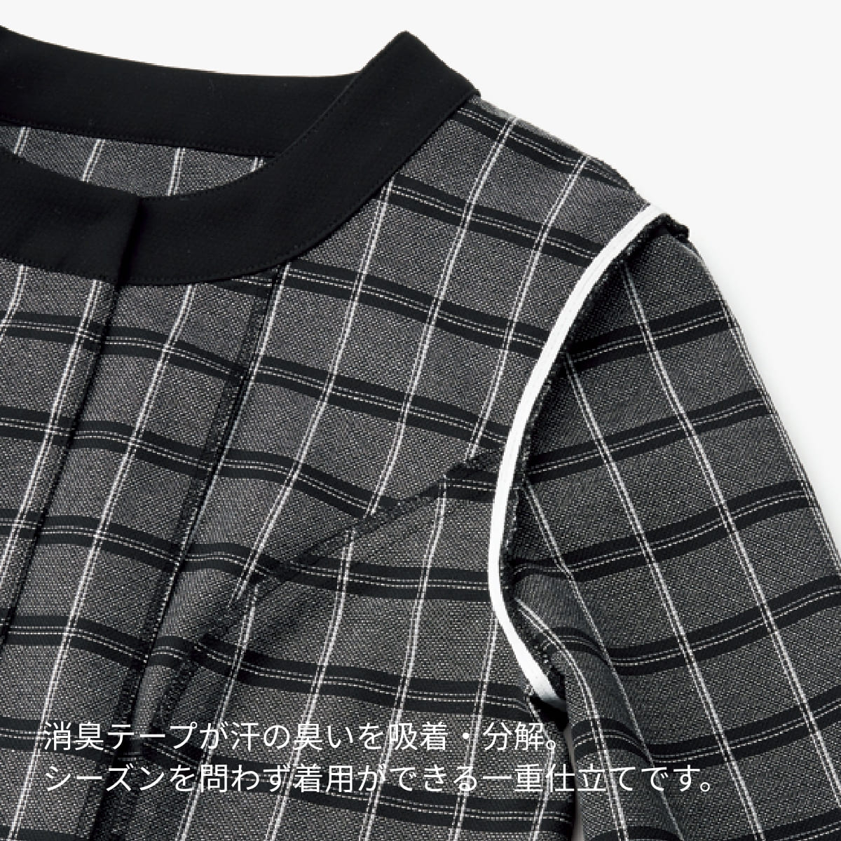 消臭テープが汗の臭いを吸着・分解。シーズンを問わず着用できる一重仕立てです。