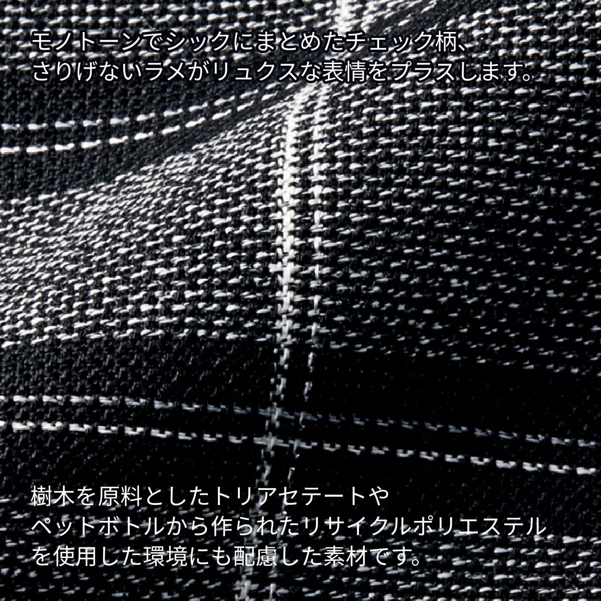 モノトーンでシックにまとめたチェック柄、さりげないラメがリュクスな表情をプラスします。樹木を原料としたトリアセテートやペットボトルから作られたリサイクルポリエステルを使用した環境にも配慮した素材です。