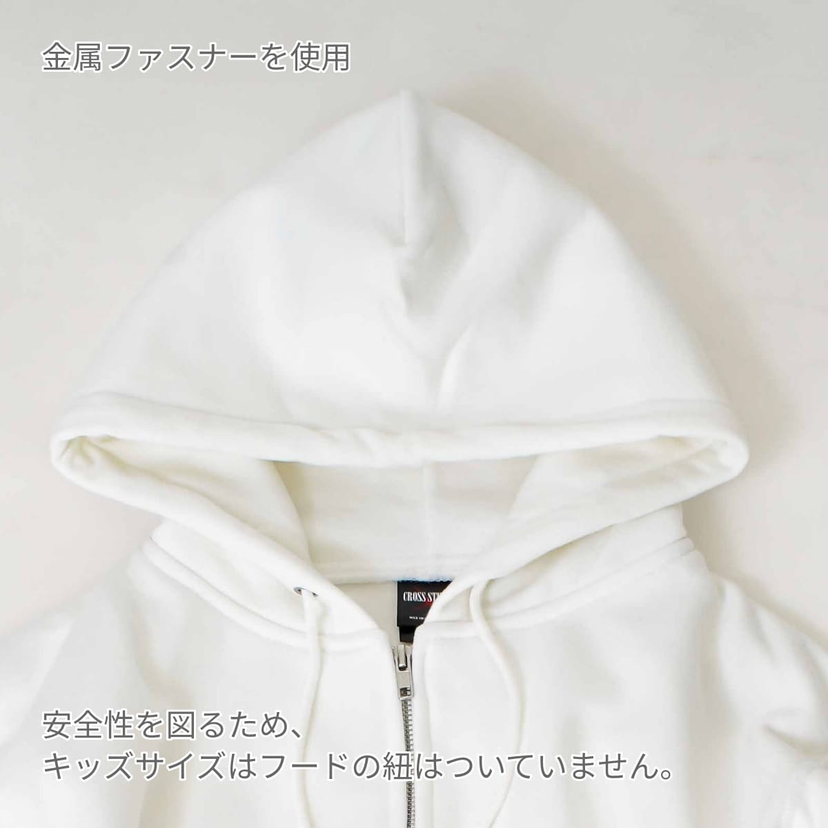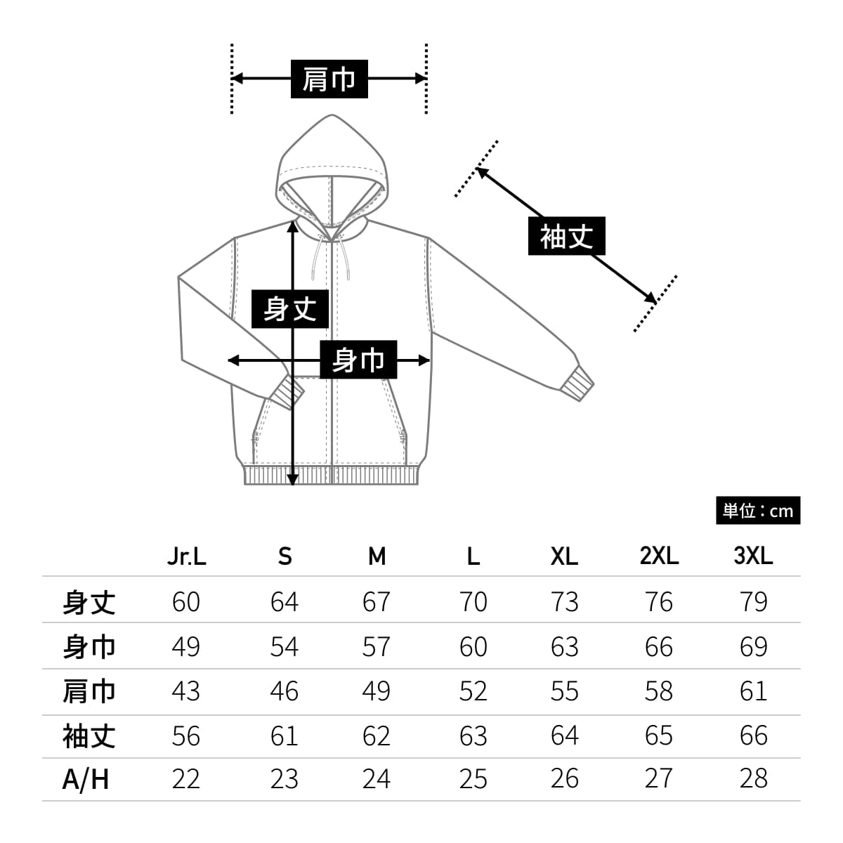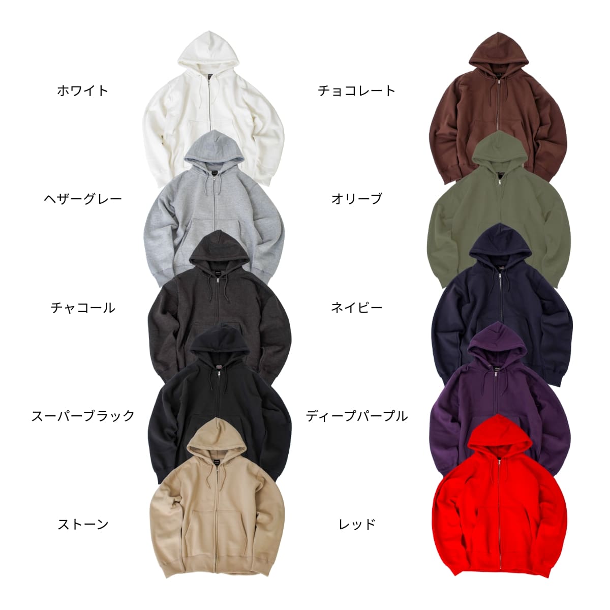 ![]() 12.4オンスの生地は、厚手でしっかりとした素材感。人気のジップアップパーカー フードは2重でしっかり立つので気になるバックスタイルも安心です。袖や裾のリブ幅も大きめで着心地を重視したデザインになっています。使いやすい定番カラーや明るい人気色も揃えています。キッズサイズは安全性を図るため、フードの紐はついていません。 |