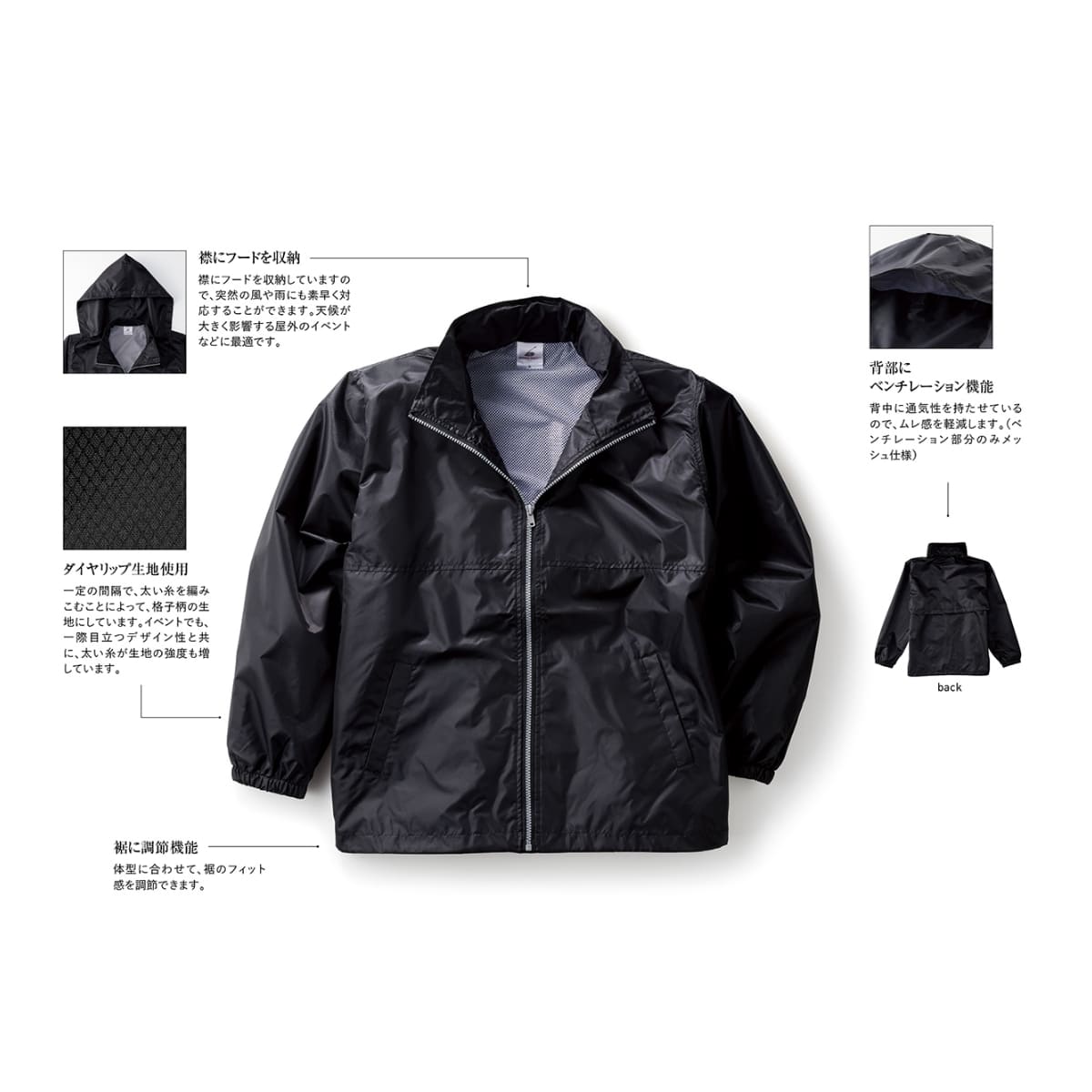 襟にフードを収納:襟にフードを収納していますので、突然の風や雨にも素早く対応することができます。天候が大きく影響する屋外のイベントなどに最適です。
