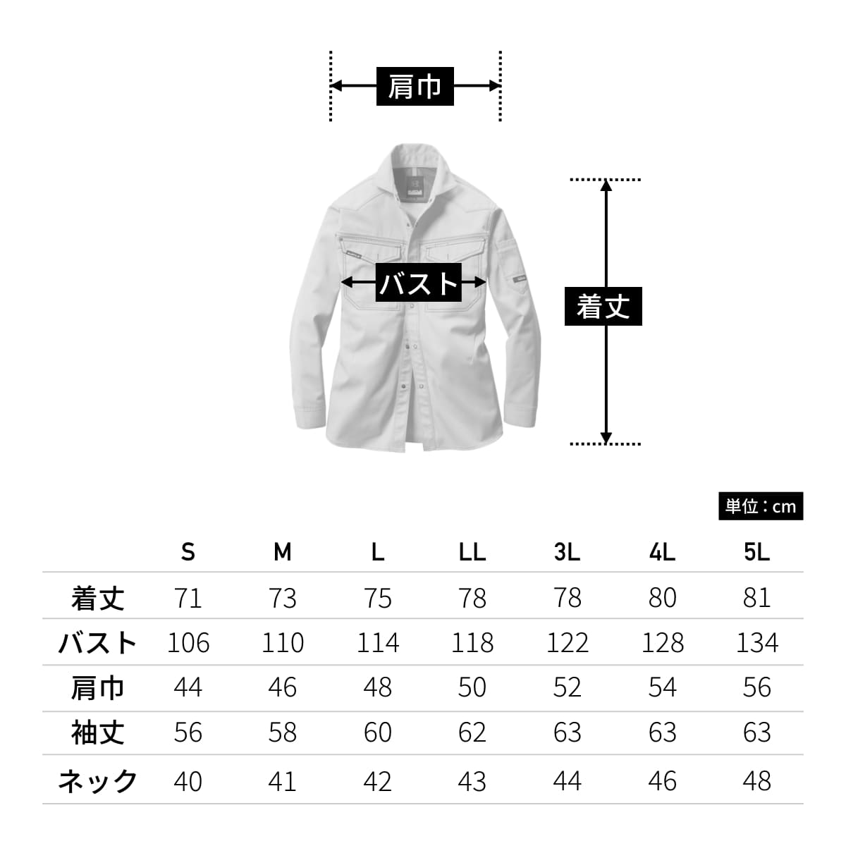 | 袖丈 | 56 | 58 | 60 | 62 | 63 | 63 | 63 |