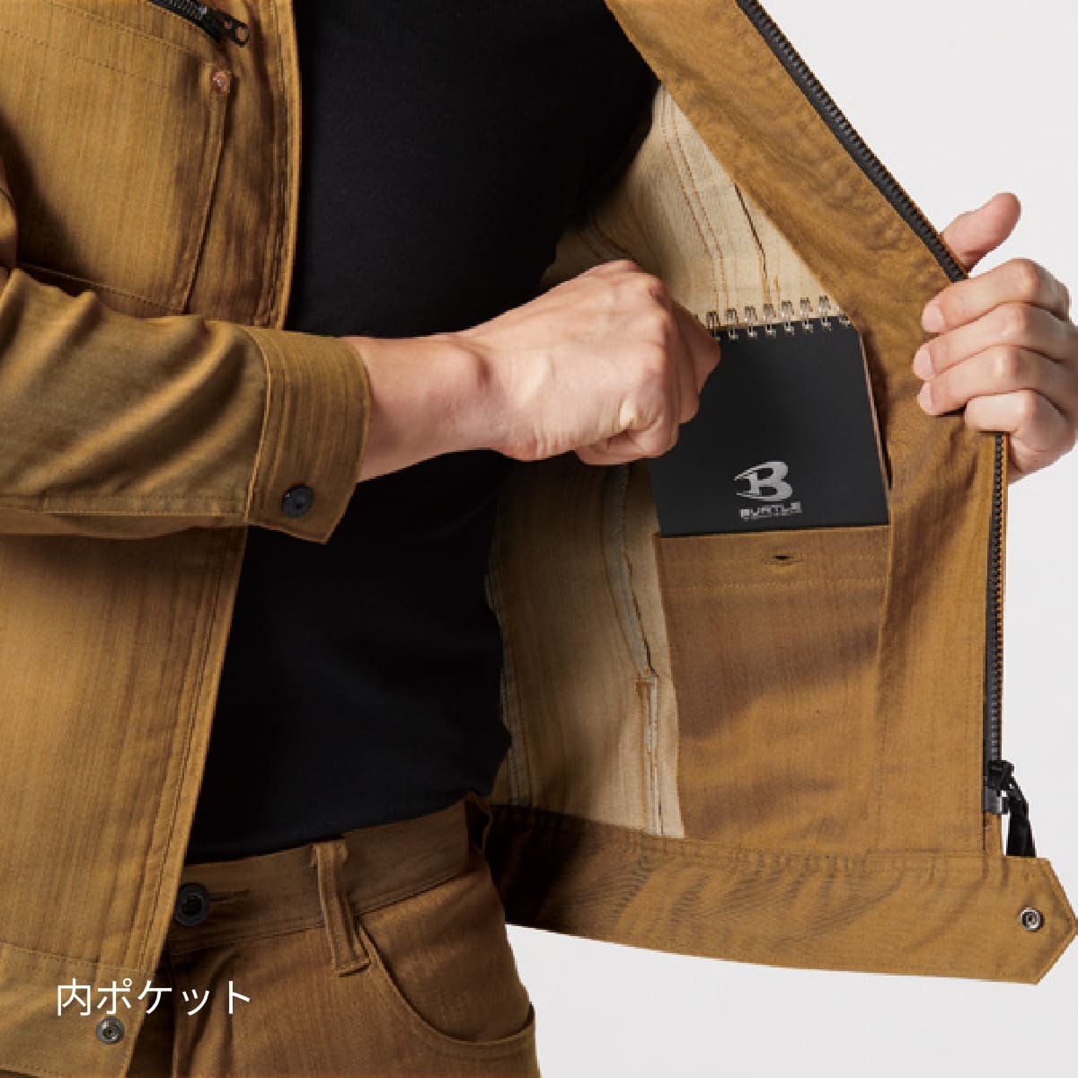 シックなアーバンブラウンにみるすグリーンをドッキングさせるギミックで一味違ったユニフォームスタイルにアップデートする手法はバートルの真骨頂。