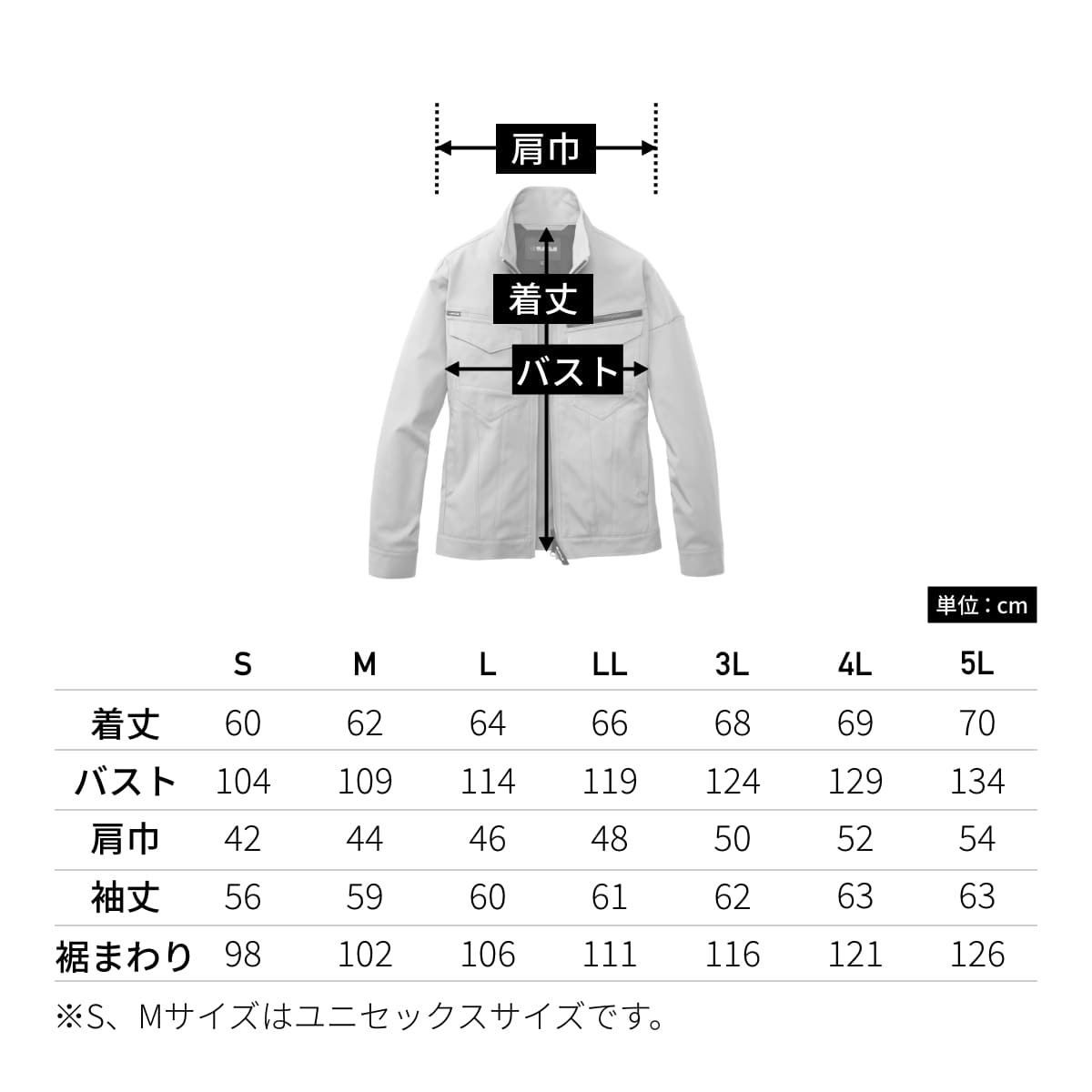 | 袖丈 | 56 | 59 | 60 | 61 | 62 | 63 | 63 |