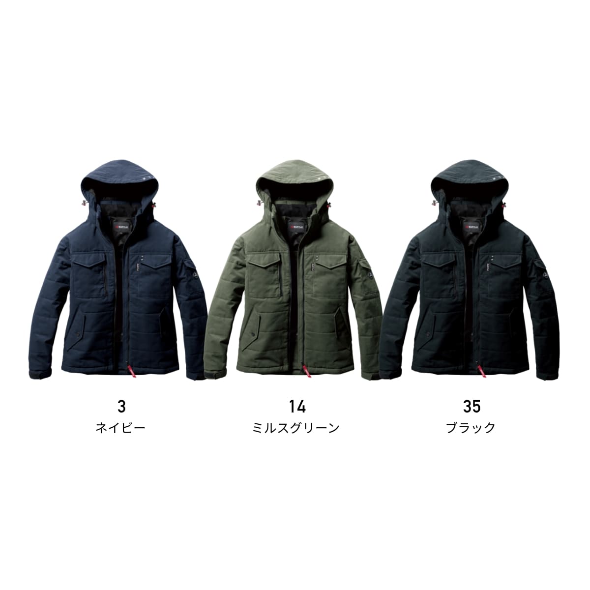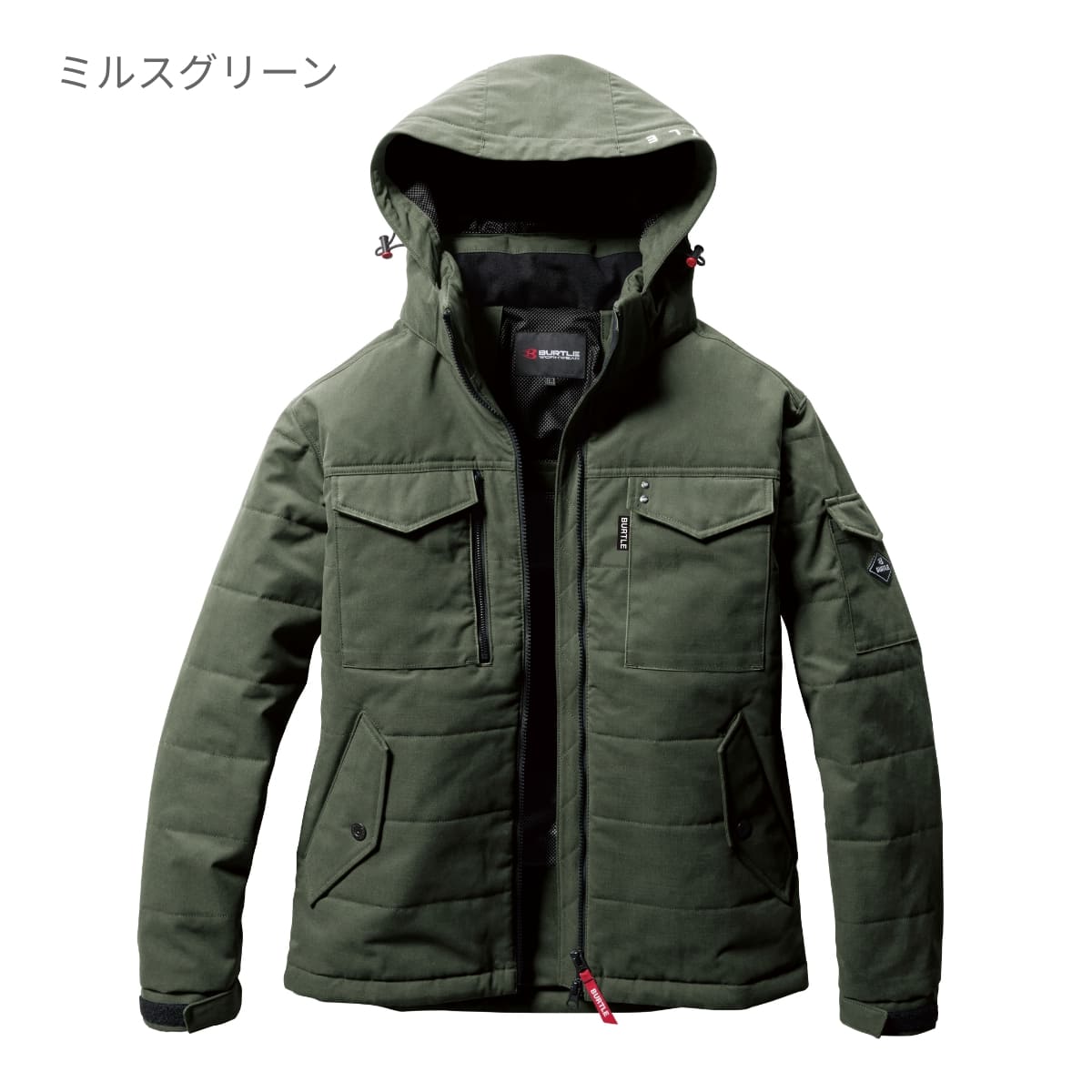 防風性と撥水性に耐久性も兼ね備えた肌触りの良いヌバック素材を使用し、フルハーネス、電熱バッドの装着に対応する本格的なミリタリールックスのハイブリッド防寒