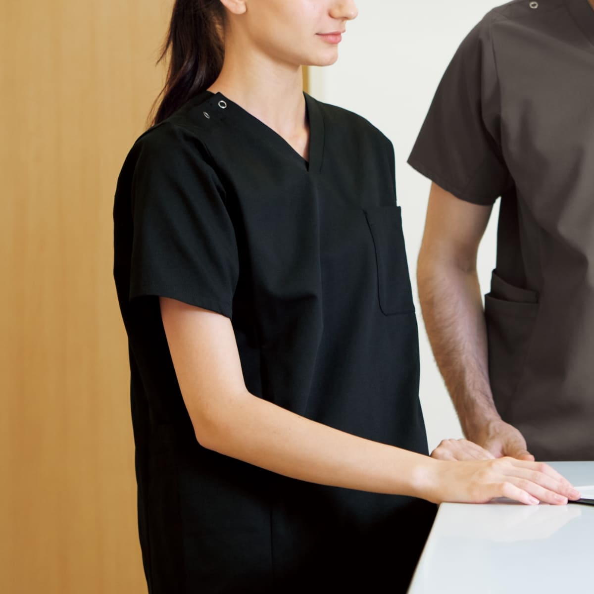 通常の仕様よりも、腕を上げて作業する方に楽に感じていただける仕様です。また、脇ポケットは患者様の邪魔にならないように配置。素材は強度はしっかりと保ちながら、肌当たりの優しいオールフレックスマルチストレッチツイル。