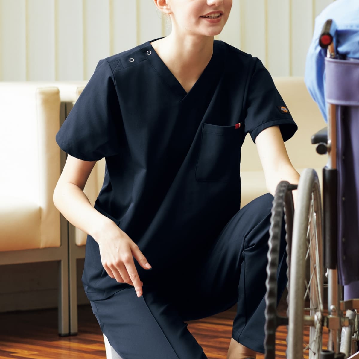 通常の仕様よりも、腕を上げて作業する方に楽に感じていただける仕様です。また、脇ポケットは患者様の邪魔にならないように配置。素材は強度はしっかりと保ちながら、肌当たりの優しいオールフレックスマルチストレッチツイル。