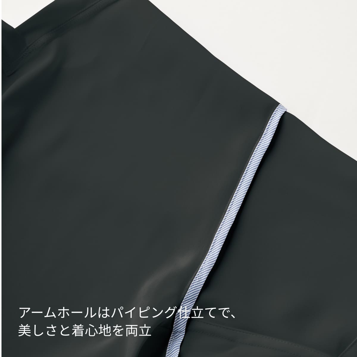 MADE IN JAPANの小松マテーレの機能性・新素材を採用。ストローのような中空の素材は、非常に軽くしなやかで、冬は中空に空気がたまり保温効果も期待できます。脇スリットで動きやすく首元のボタンで着脱もしやすく快適な着心地に。ストライプの裏地もオシャレなポイントで、パイピング処理など縫製面でもワンランク上に仕上がった、シンプルなデザインと機能性で高級感溢れる、メンズスクラブです。
