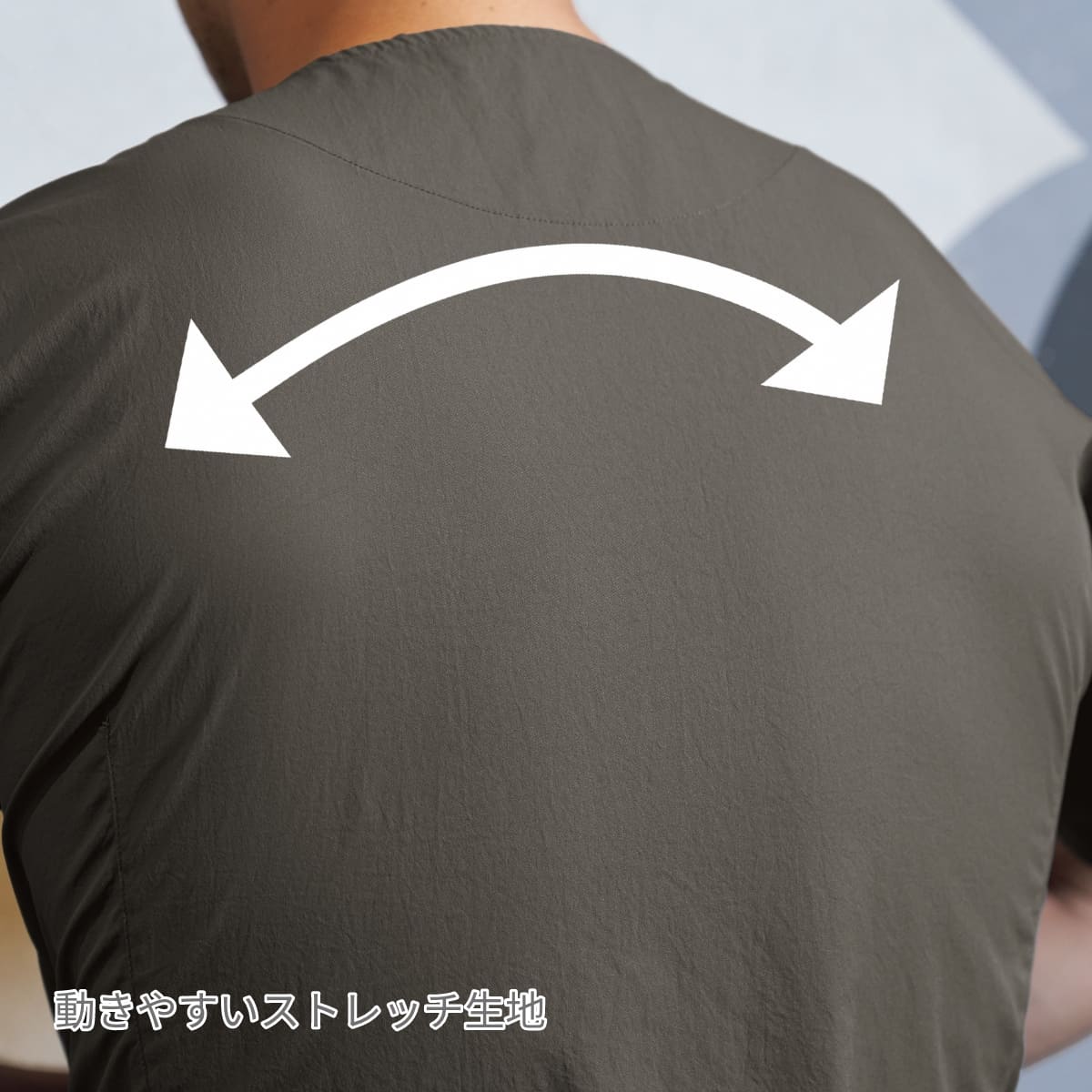 小松マテーレ独自の「染料役者」という機械を使い、ポリエステルを製品染めすることで、ニュアンスのある色ムラや色合いが独特の風合いを感じさせるビンテージ感を再現しました。味のある素材感の見た目に対し、滑らかなタッチで着心地が抜群。ポリエステル100%の素材で、イージーケアなのも魅力の一つです。素材感の良さを活かすため、全体的にシンプルにしつつも、後ろのダーツやニュアンスのあるポケットなど、ジャケットをイメージしたディテールを取り入れて、F Lab.(エフラブ)ならではの高級感を演出。ナチュラルなシワ感と柔らかくストレッチ性のある生地で、デザイン性と機能性に優れたメンズスクラブです。 ※こちらの商品は、アイロンをかけずにシワ感をお楽しみください。(ポリエステルなので一度シワになったものはアイロンをしても綺麗にはなりません。)