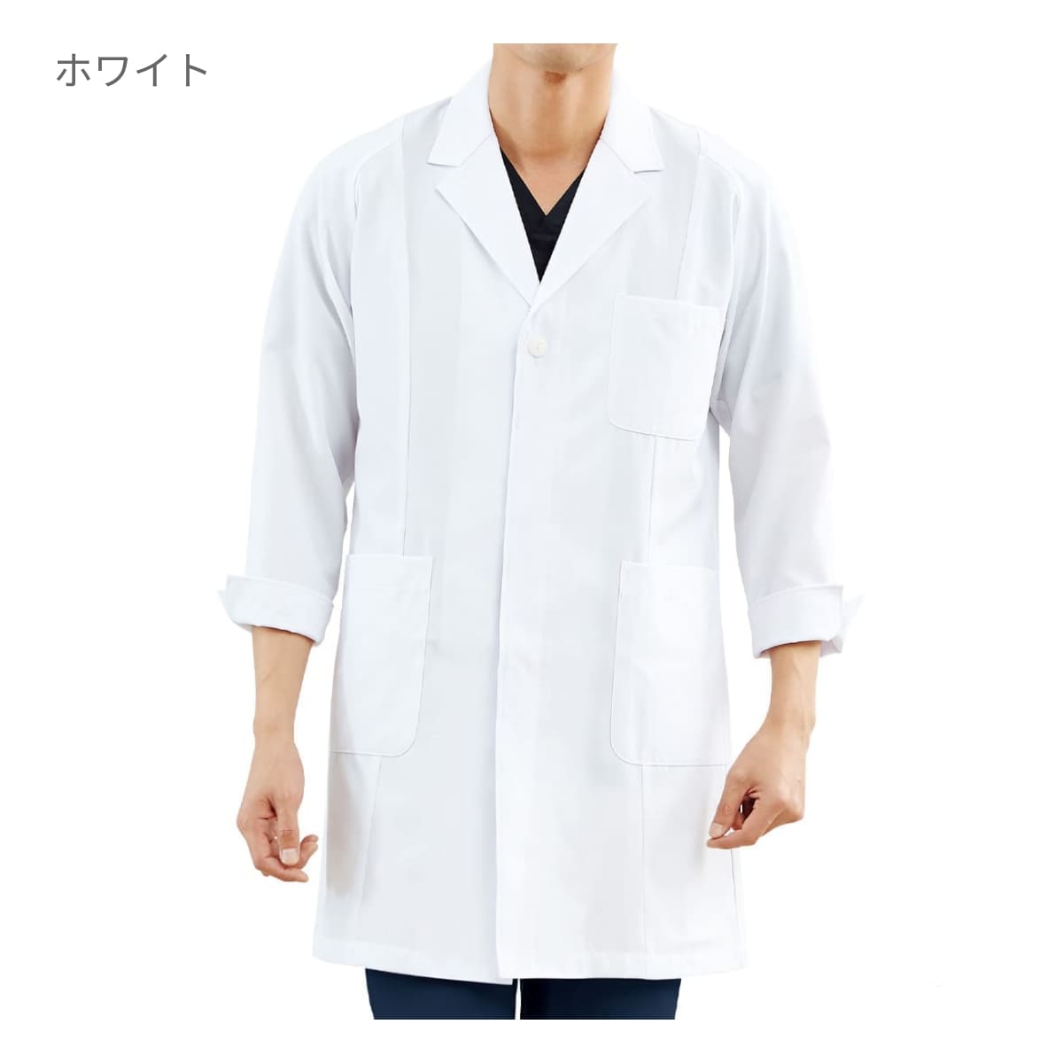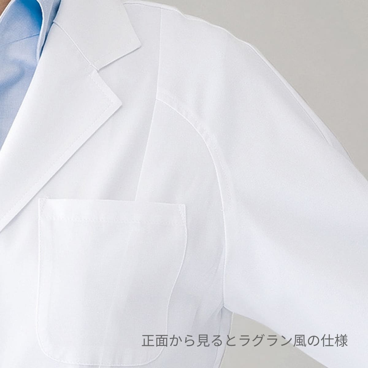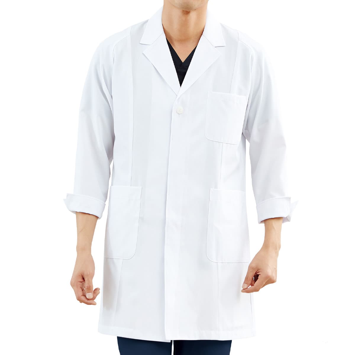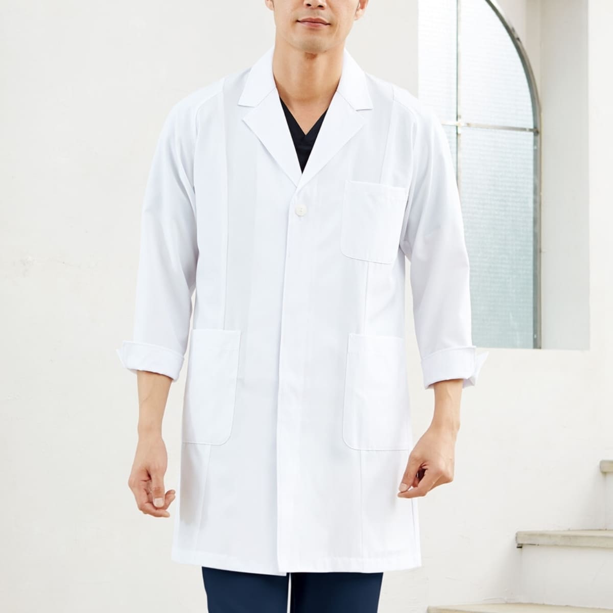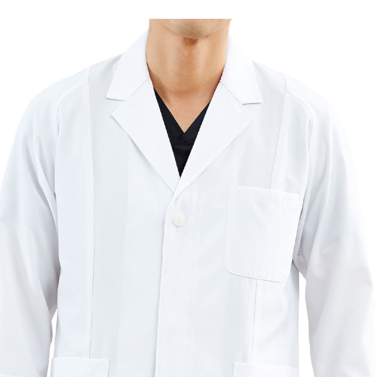 ゆとりのある袖ぐりで動きやすく、繊細なディテールにこだわった上質な男性用ドクターコート