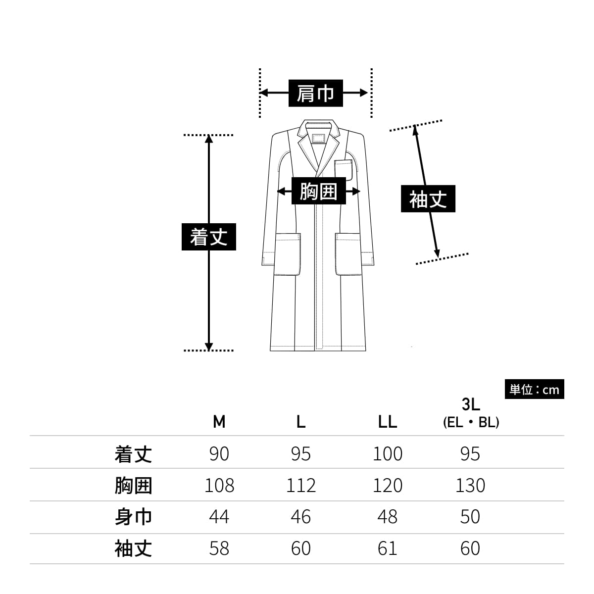 仕様:前ボタン/左胸ポケット/右腰ポケット内側ペン差し布付/両腰ポケット/袖口スリット入り