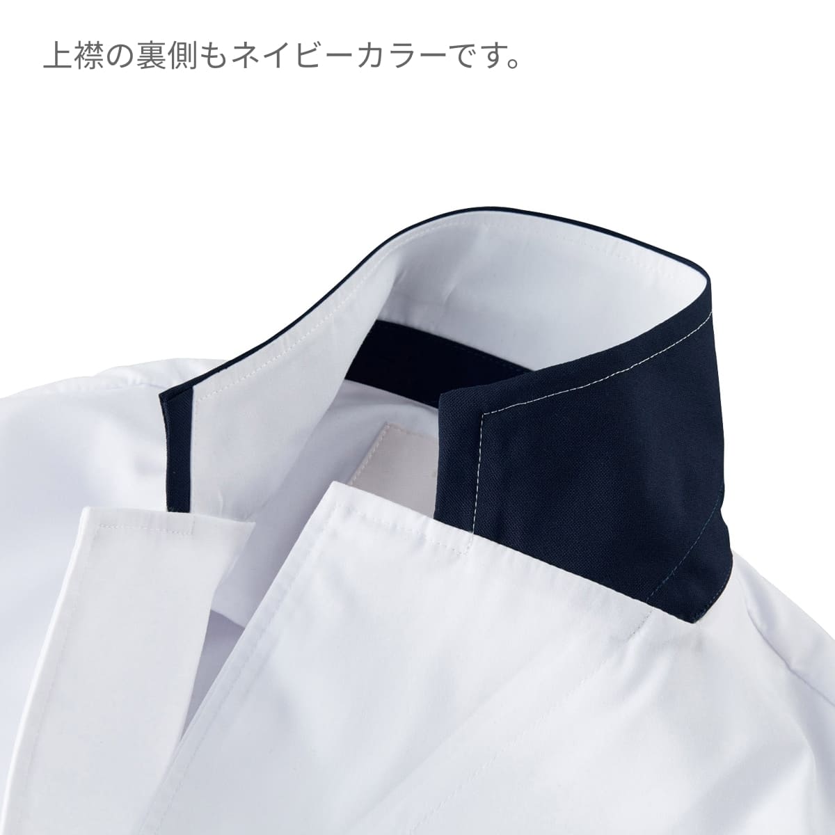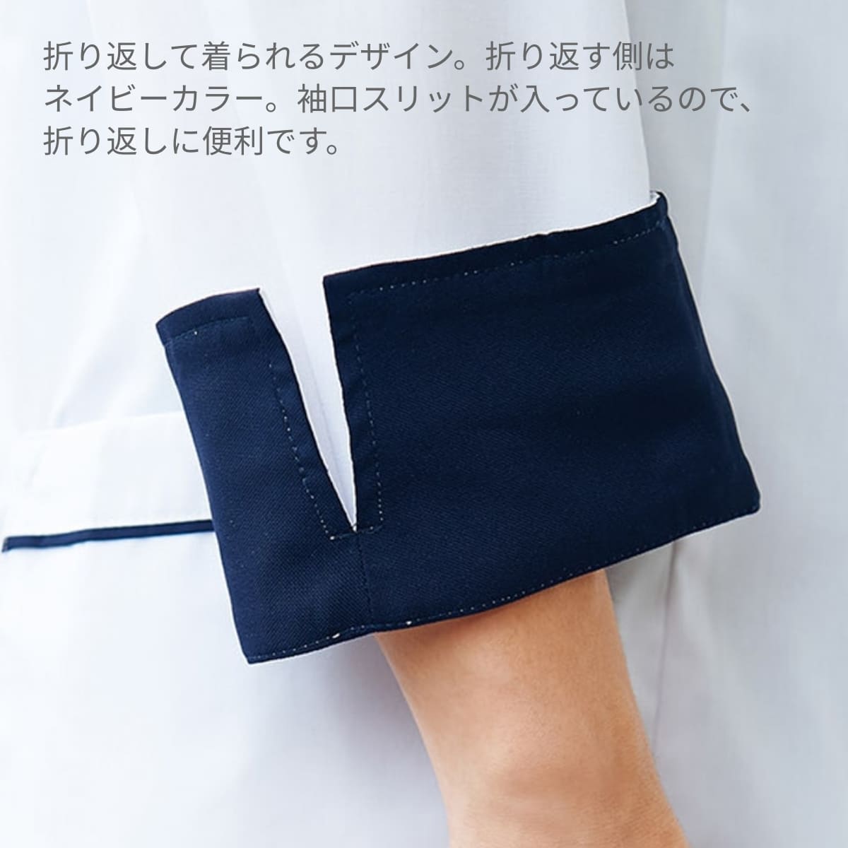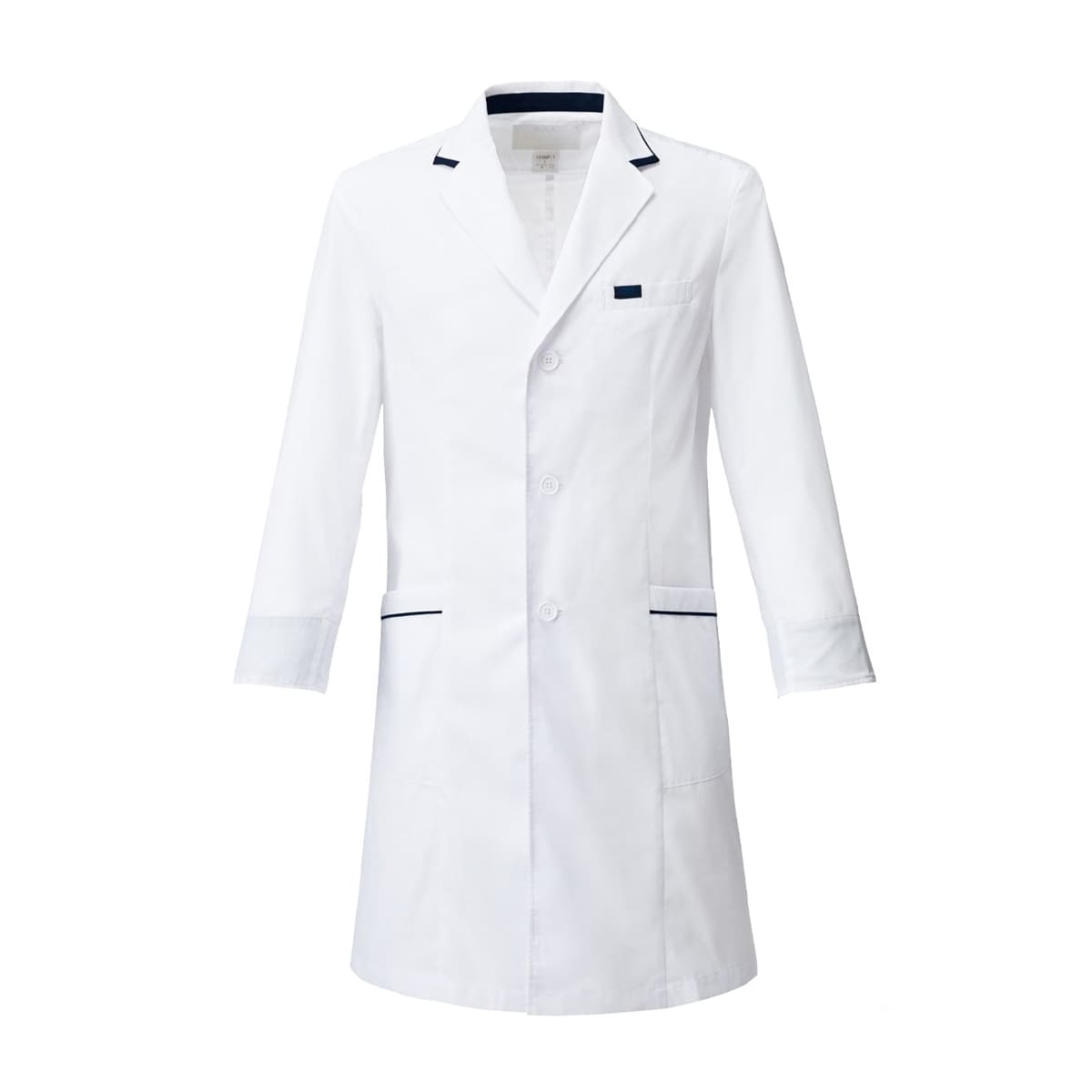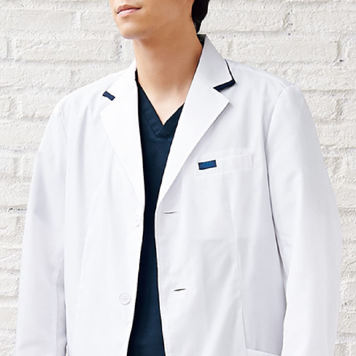 衿、衿裏、袖口に洗濯に強いネイビー生地を配置し、デザイン性と洗濯耐久性に優れたスタイリッシュなドクターコート