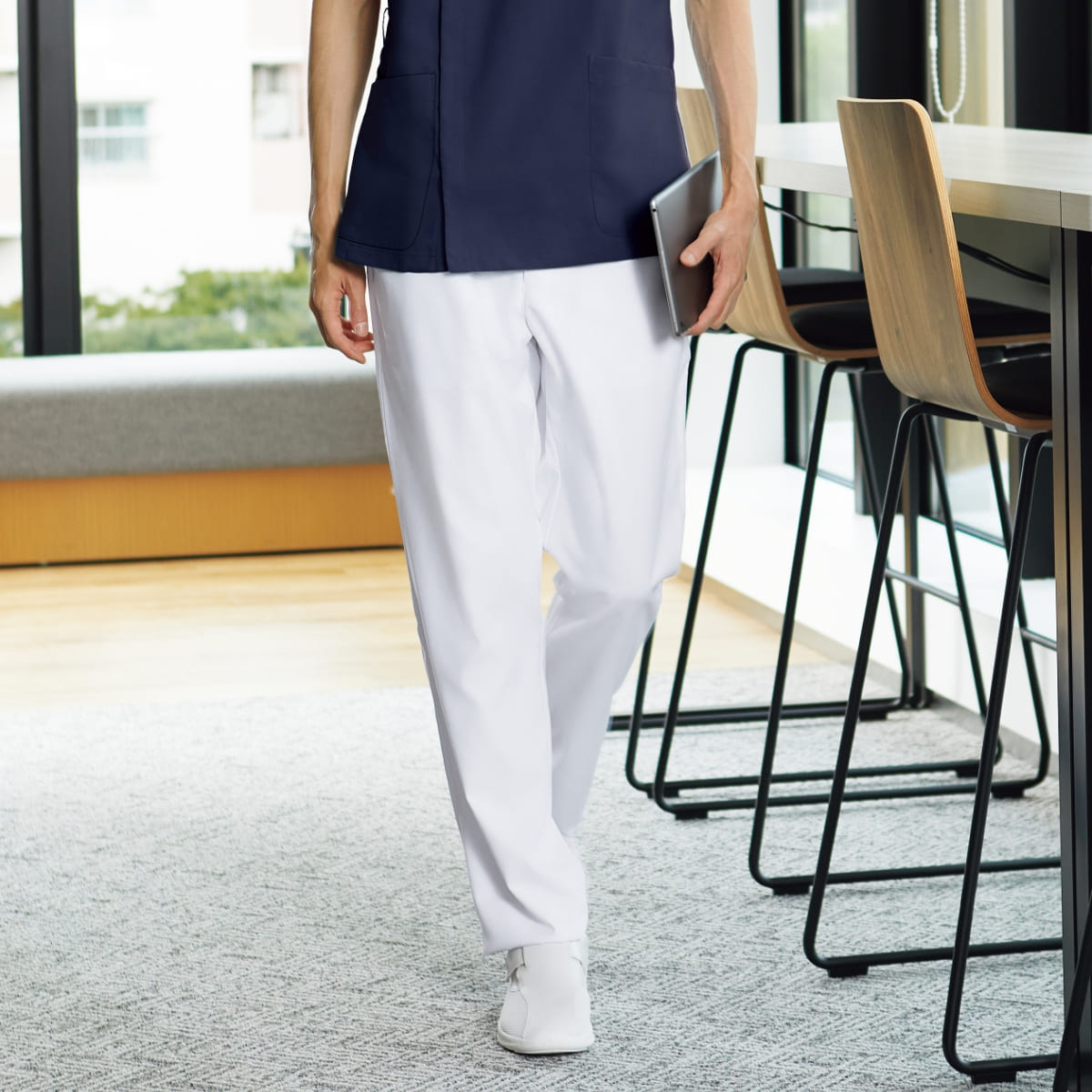 らくらくストレッチでスクラブにフィットする、男性用のスリムストレートパンツ