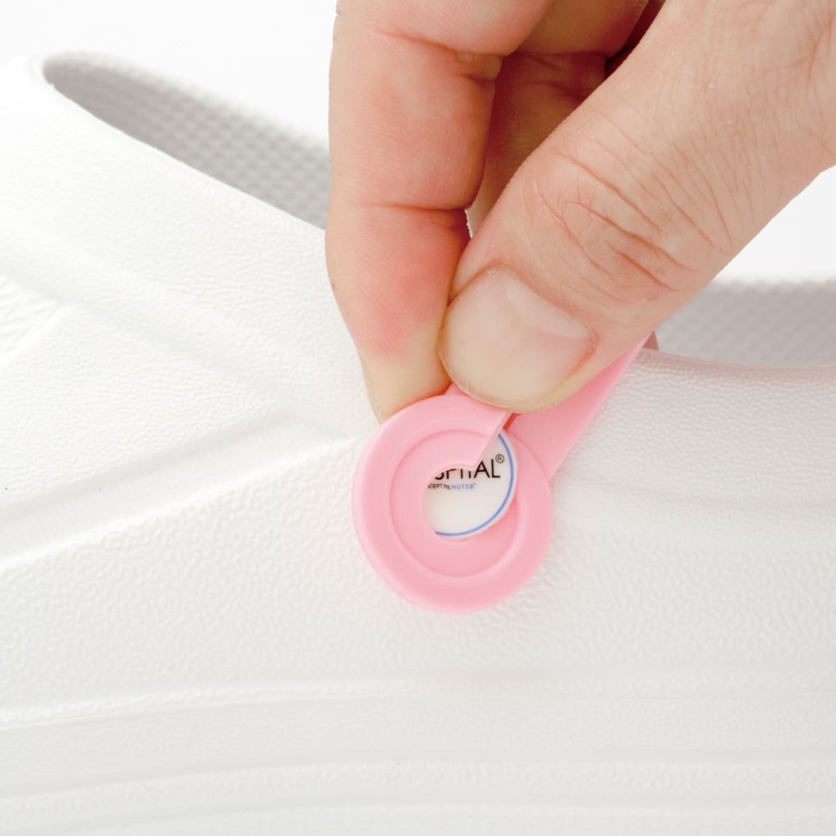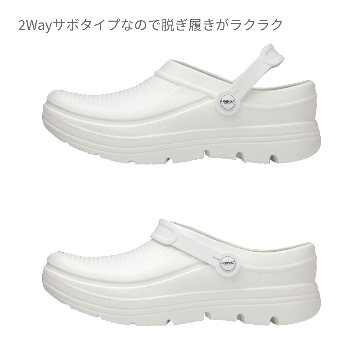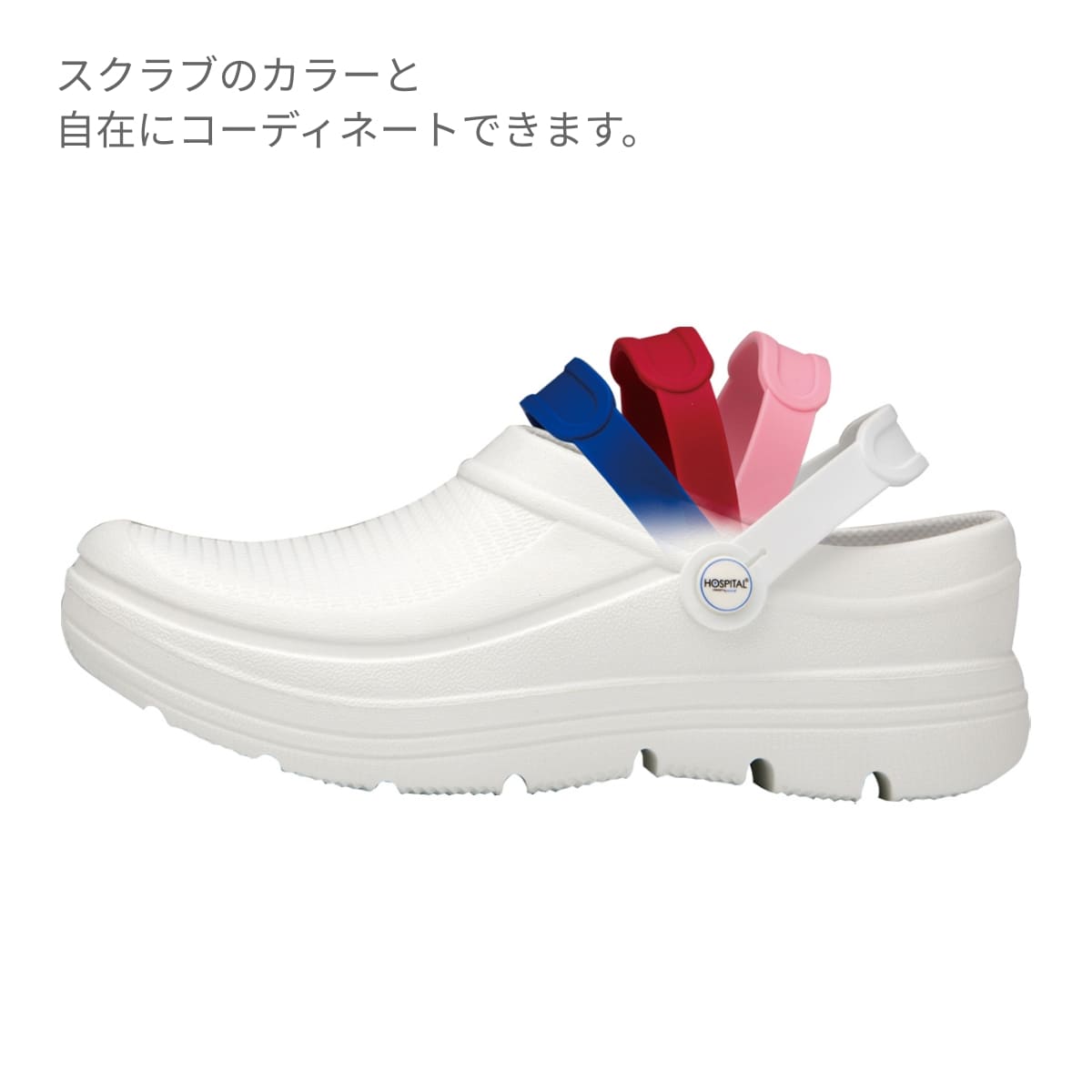 シューズとサンダルの良い部分を採用した形状なので、ゆったり履けるのに脱げたりしません。4色のベルトがセットになっていて、スクラブのカラーと自在にコーディネートが可能。ストラップは可動式で、バックストラップタイプにもサボサンダルにも切り替え自在の2way仕様で脱ぎ履きが楽チンです。ソールにはベンチレーションをたくさん開けたことで、通気性も抜群。完全一体成形型のため、ソールの剥がれ等の心配もなし。クッション性が良く一日中履いていても疲れにくい、快適な男女兼用シューズです。