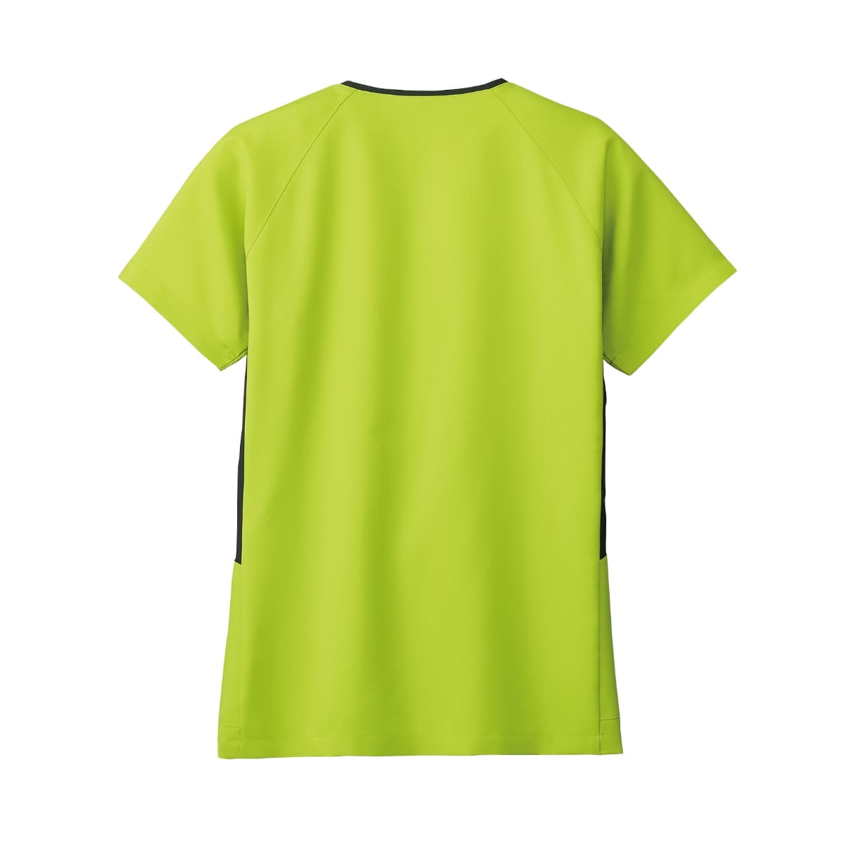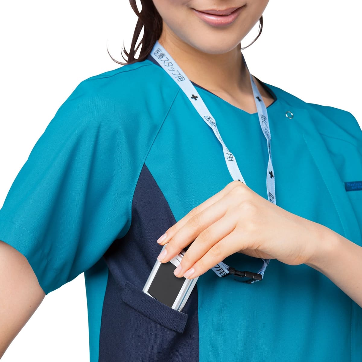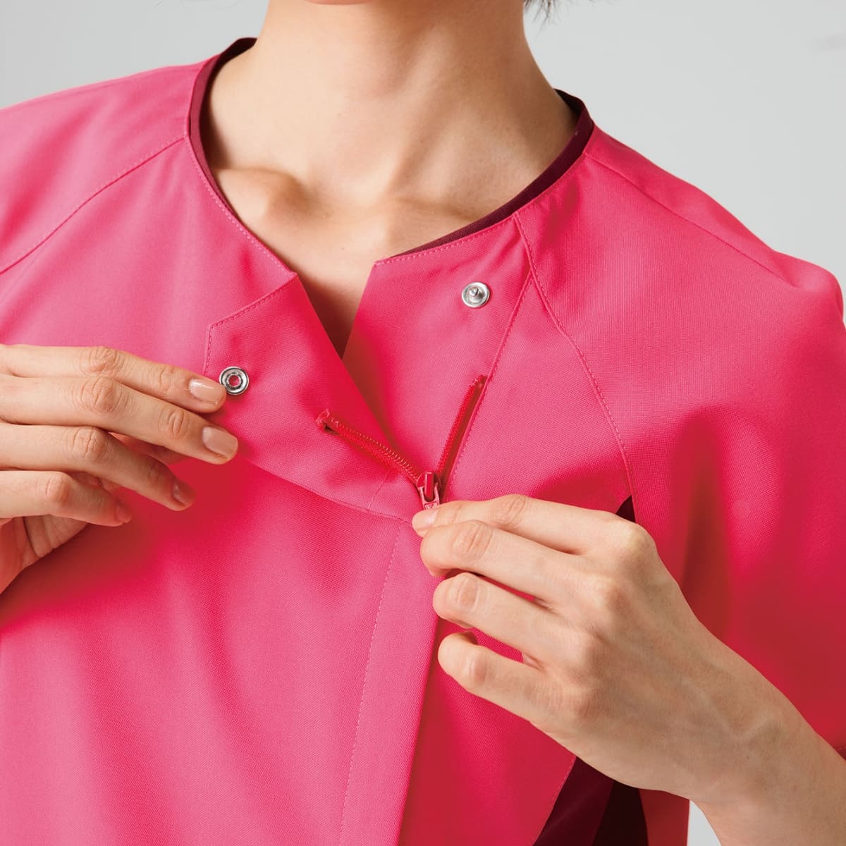 羽織って着られるジップタイプなので、着脱時に髪が乱れたりメイクが崩れたりする心配もなく安心で快適な着心地です。脇下のカラー配色の切り替えは、シルエットがスッキリ見える細見え効果と、汗のシミを目立たせない効果のある、女性に嬉しいデザインに。素材は、強固なマスト(帆)をイメージして開発したイリアスマストを使用。機能糸クールエスパーは速やかに体の汗を吸い取り、ハリコシのあるサラリとした素材感が特徴です。元気で明るいビタミンカラーのスクラブは、さまざまな職種や年代の方におすすめ。機能的でデザイン性に優れたレディースジップスクラブです。