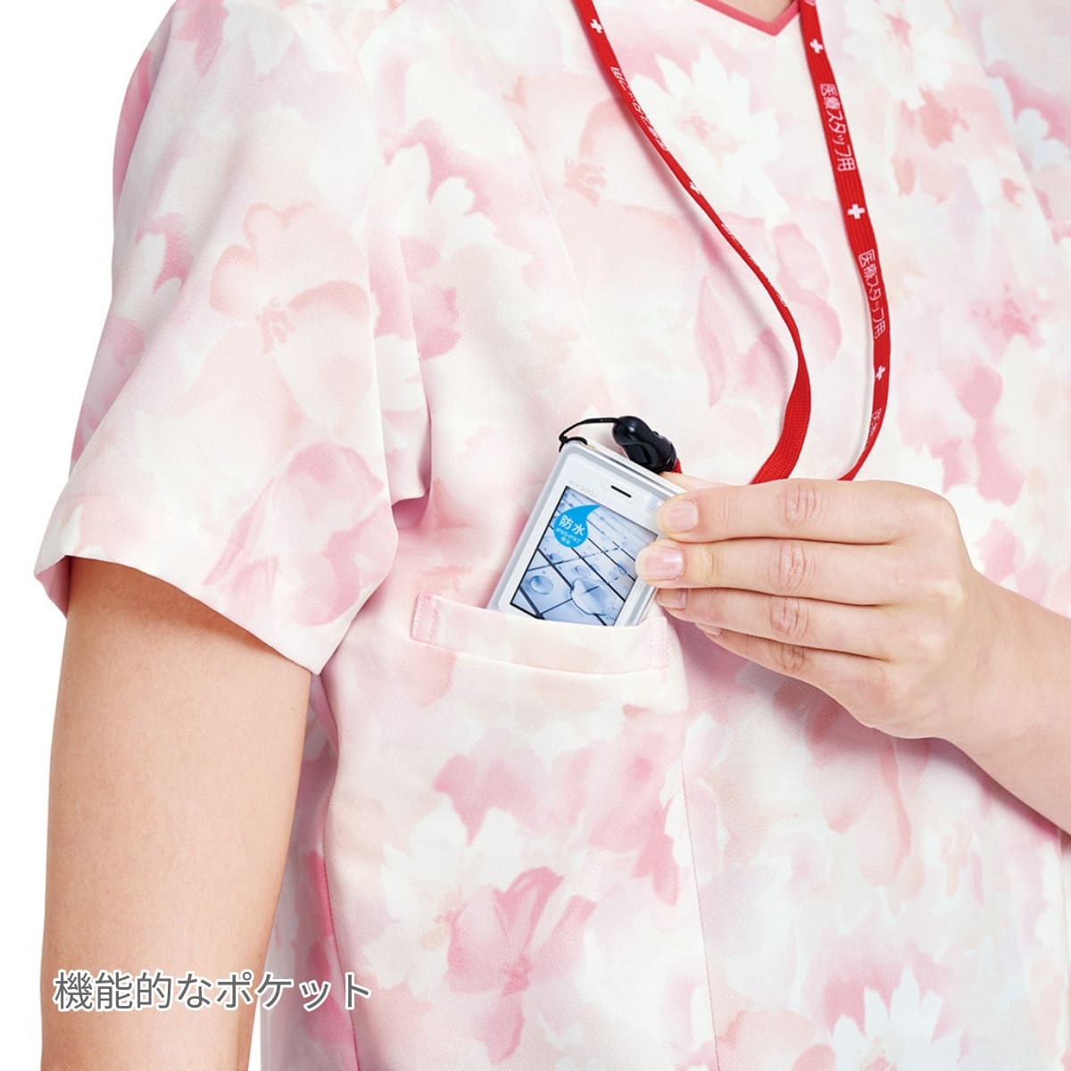 病院スタッフと患者さんに看護服がどのような印象を与えるかの研究から、花柄のウエアは「明るい」「やわらかい」優しい」といったイメージを与えることが分かり、患者さんの不安や緊張を和らげる効果が期待できます。イージーケア性に優れており、洗濯しても色褪せしにくい高耐久素材を使用。羽織って着られるジップタイプなので、着脱が楽チン。着脱時に髪が乱れたりメイクが崩れる心配がなく快適です。襟部分の差し色がオシャレなポイント。デザイン性と機能性に優れた花柄のレディースジップスクラブです。