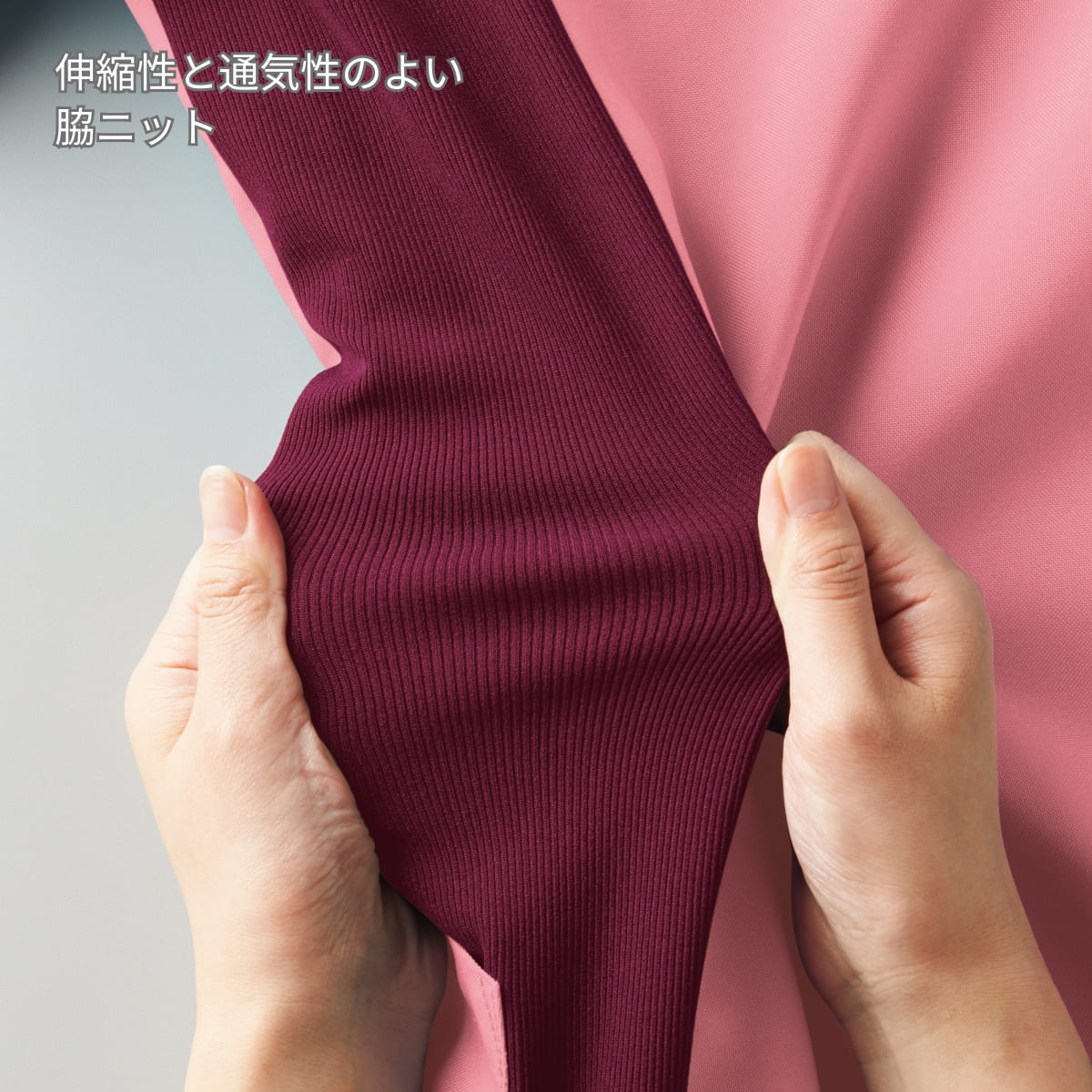 動かすことが多い背中と脇部分にストレッチ性の高いニット素材を施すことで動きやすく、アクティブな職種の方にオススメです。女性らしいシルエットを保ちつつ、いままで以上の着心地に。アクセントカラーを効かせたスポーティーなリブ配色の襟元は、ポロシャツ仕様にすることで、汗を吸収しやすく、暑い夏でも快適。右肩のループは、ストラップを首に回さないための仕様で衛生的かつ首元が擦れたりすることもなく安心です。他にも収納に便利な脇ループや小分けポケットなどを配置。羽織って着られるジップタイプのスクラブなので、着脱時に髪が乱れたりメイクが崩れる心配がありません。伸縮性と通気性のよい、快適ニット素材のレディースジップスクラブです。