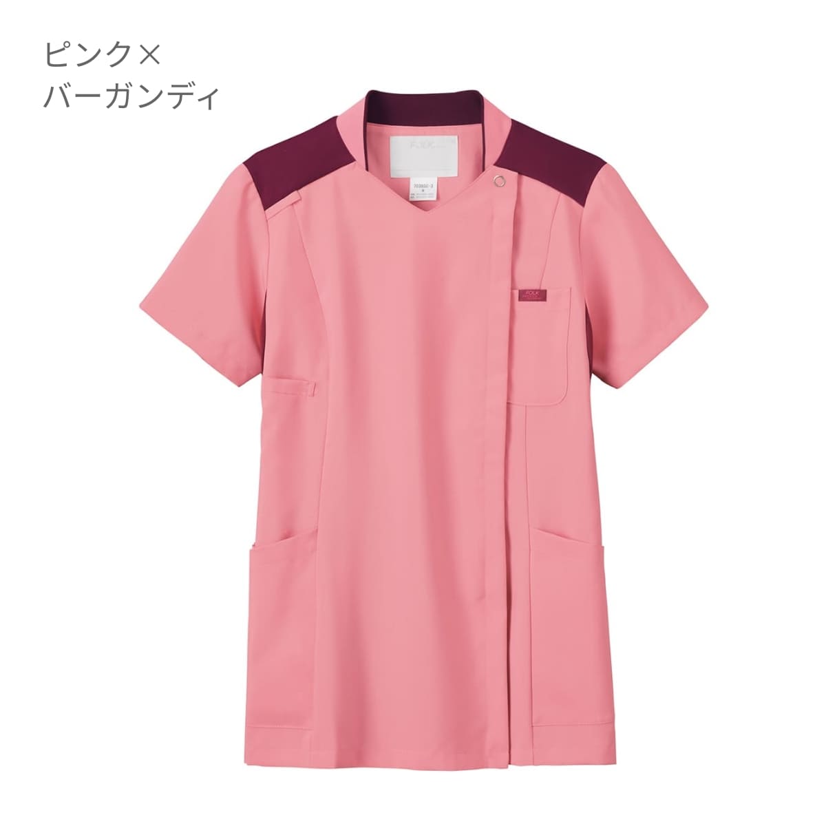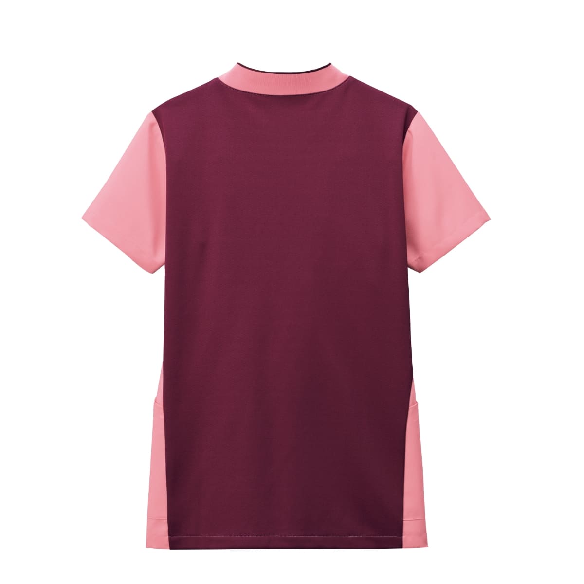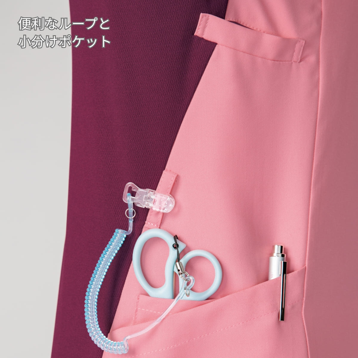 動かすことが多い背中と脇部分にストレッチ性の高いニット素材を施すことで動きやすく、アクティブな職種の方にオススメです。女性らしいシルエットを保ちつつ、いままで以上の着心地に。アクセントカラーを効かせたスポーティーなリブ配色の襟元は、ポロシャツ仕様にすることで、汗を吸収しやすく、暑い夏でも快適。右肩のループは、ストラップを首に回さないための仕様で衛生的かつ首元が擦れたりすることもなく安心です。他にも収納に便利な脇ループや小分けポケットなどを配置。羽織って着られるジップタイプのスクラブなので、着脱時に髪が乱れたりメイクが崩れる心配がありません。伸縮性と通気性のよい、快適ニット素材のレディースジップスクラブです。