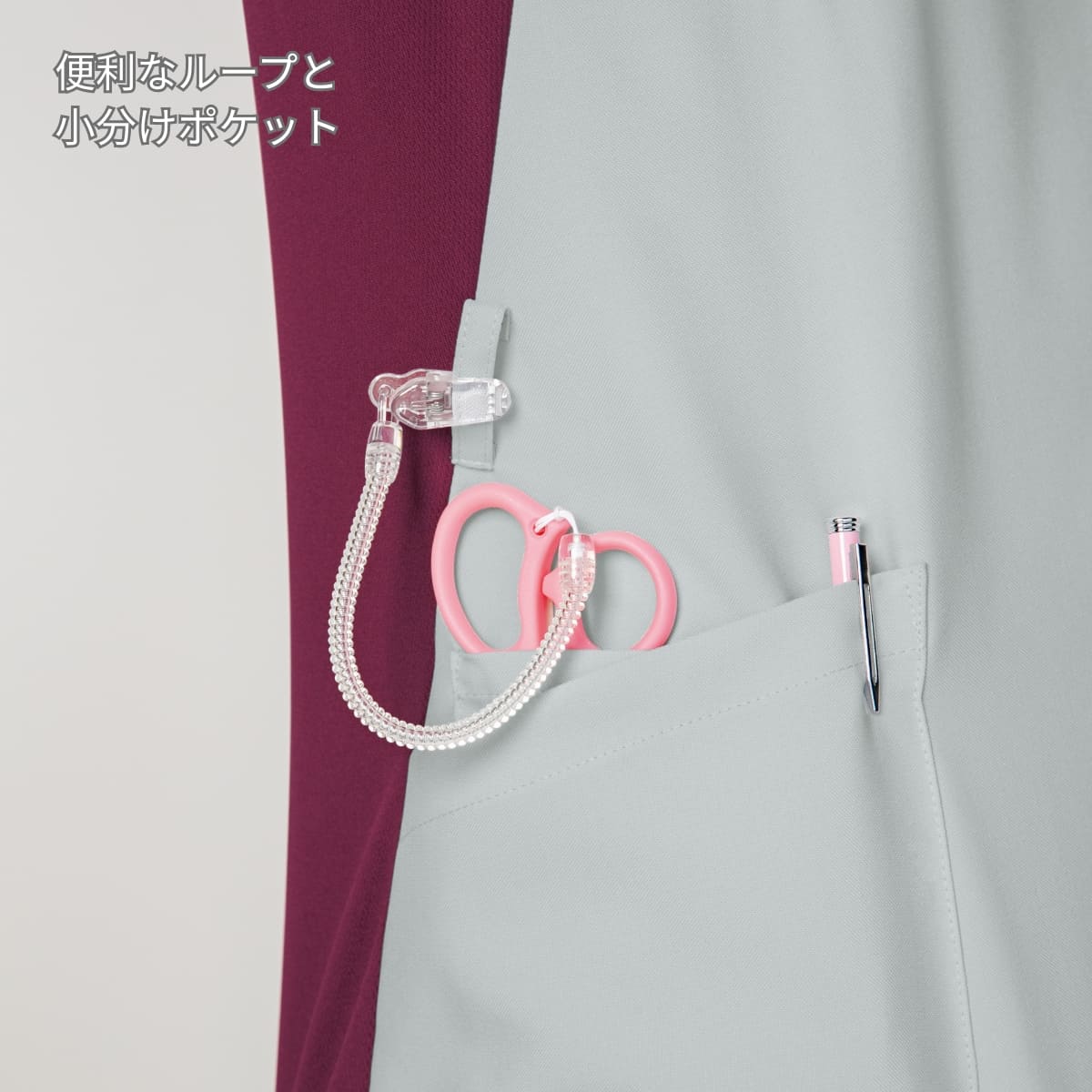 動かすことが多い背中と脇部分にストレッチ性の高いニット素材を施すことで、動きやすくアクティブな職種の方にオススメです。アクセントカラーを効かせたスポーティーなリブ配色の襟元は、ポロシャツ仕様にすることで、汗を吸収しやすく、快適な着心地に。右肩のループは、ストラップを首に回さないための仕様で衛生的かつ首元が擦れたりもせず安心です。他にも収納に便利な脇ループや小分けポケットなどを配置。羽織って着られるジップタイプのスクラブなので、着脱時に髪が乱れたりメイクが崩れる心配がありません。同デザインのメンズジップスクラブ(7044SC)とペアで着用可能。伸縮性と通気性のよい、快適ニット素材のレディースジップスクラブです。