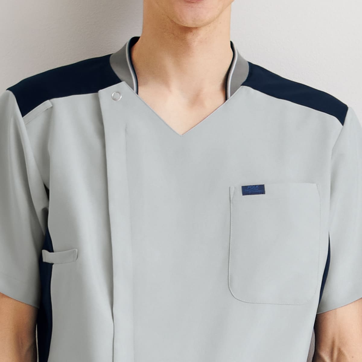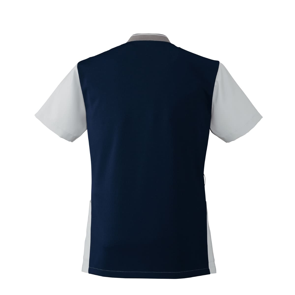 動かすことが多い背中と脇部分にストレッチ性の高いニット素材を施すことで動きやすく、アクティブな職種の方にオススメです。アクセントカラーを効かせたスポーティーなリブ配色の襟元は、ポロシャツ仕様にすることで、汗を吸収しやすく、快適な着心地に。右肩のループは、ストラップを首に回さないための仕様で衛生的かつ首元が擦れたりもせず安心です。他にも収納に便利な脇ループや小分けポケットなどを配置。羽織って着られるジップタイプのスクラブなので、着脱時に髪が乱れたりする心配がありません。同デザインのレディースジップスクラブ(7043SC)とペアで着用可能。伸縮性と通気性のよい、快適ニット素材のメンズジップスクラブです。