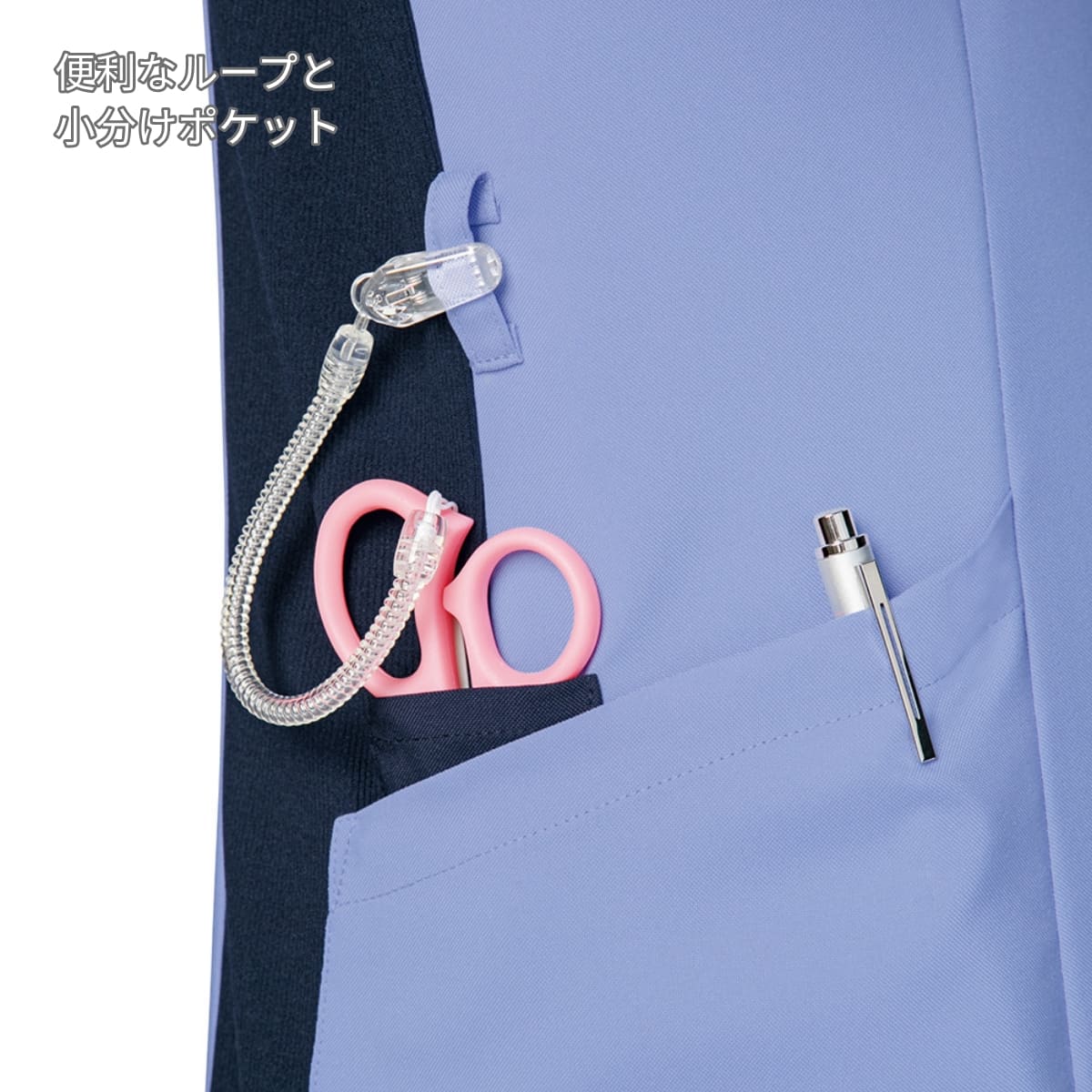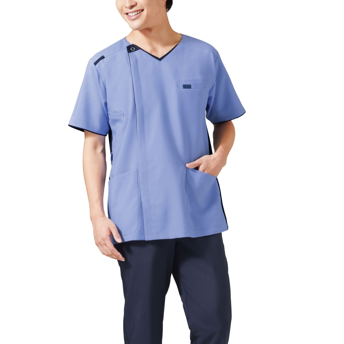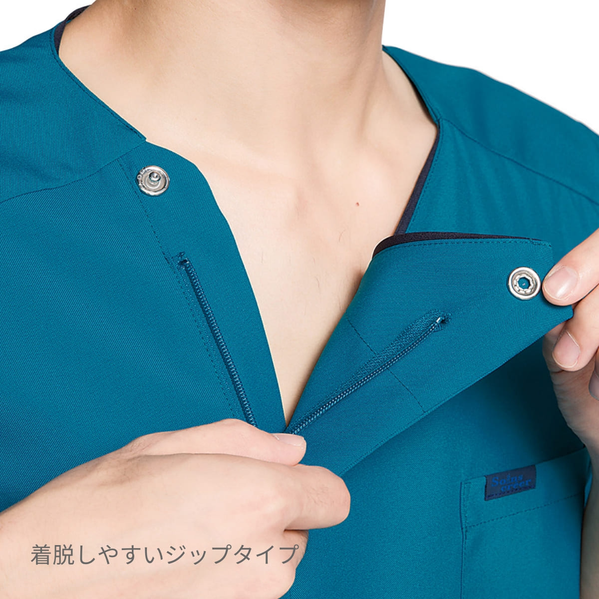 通気性がよく、伸縮性のある透けない畦編みニットを脇部分に採用したことで、腕の上げ下げなど大きな動きがしやすく、肌にまとわりつかないさらっとした着心地が魅力です。濃い色のニットなので汗をかいても目立たないというのも嬉しいポイント。グッドデザイン賞を受賞した、羽織って着られるジップタイプなので、着脱時に髪が乱れたりすることがなく安心で快適です。タブレットも入る大きさのポケットや、便利な脇ループなど機能性抜群。同デザインのレディースジップスクラブ(7050SC)と男女ペアで着用いただけるメンズジップスクラブです。