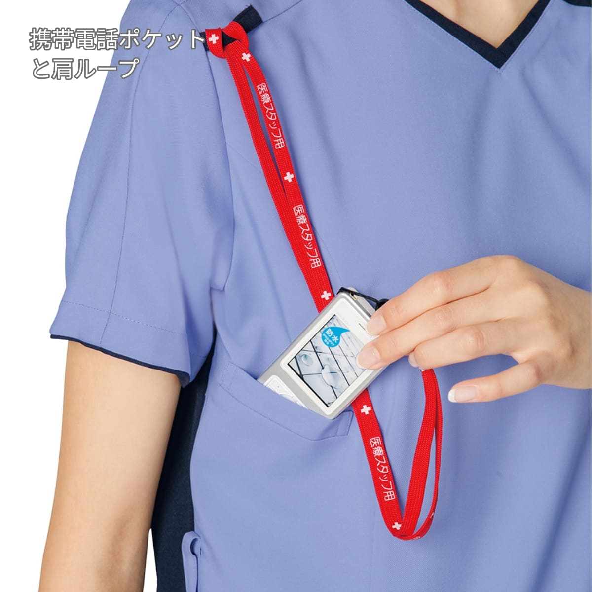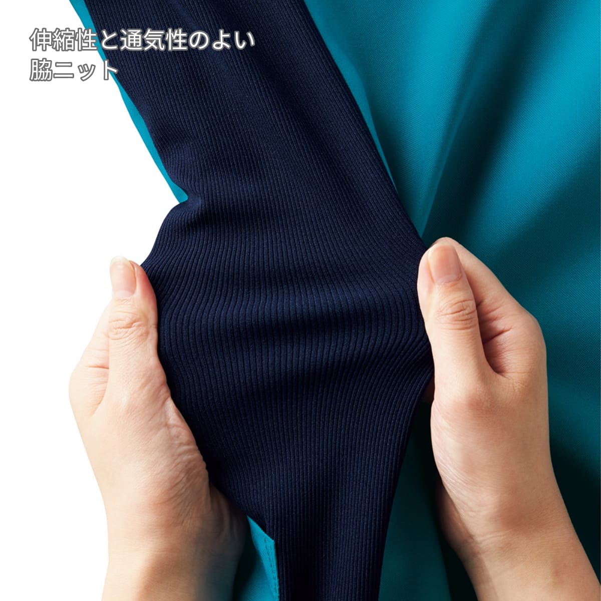 通気性がよく、伸縮性のある透けない畦編みニットを脇部分に採用したことで、腕の上げ下げなど大きな動きがしやすく、肌にまとわりつかないさらっとした着心地が魅力です。濃い色のニットなので汗をかいても目立たないというのも嬉しいポイント。グッドデザイン賞を受賞した、羽織って着られるジップタイプなので、着脱時に髪が乱れたりすることがなく安心で快適です。タブレットも入る大きさのポケットや、便利な脇ループなど機能性抜群。同デザインのレディースジップスクラブ(7050SC)と男女ペアで着用いただけるメンズジップスクラブです。