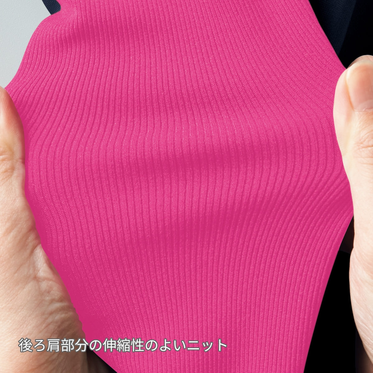 肩ニットで動きやすい、スレンダーシルエットのレディースジップスクラブ