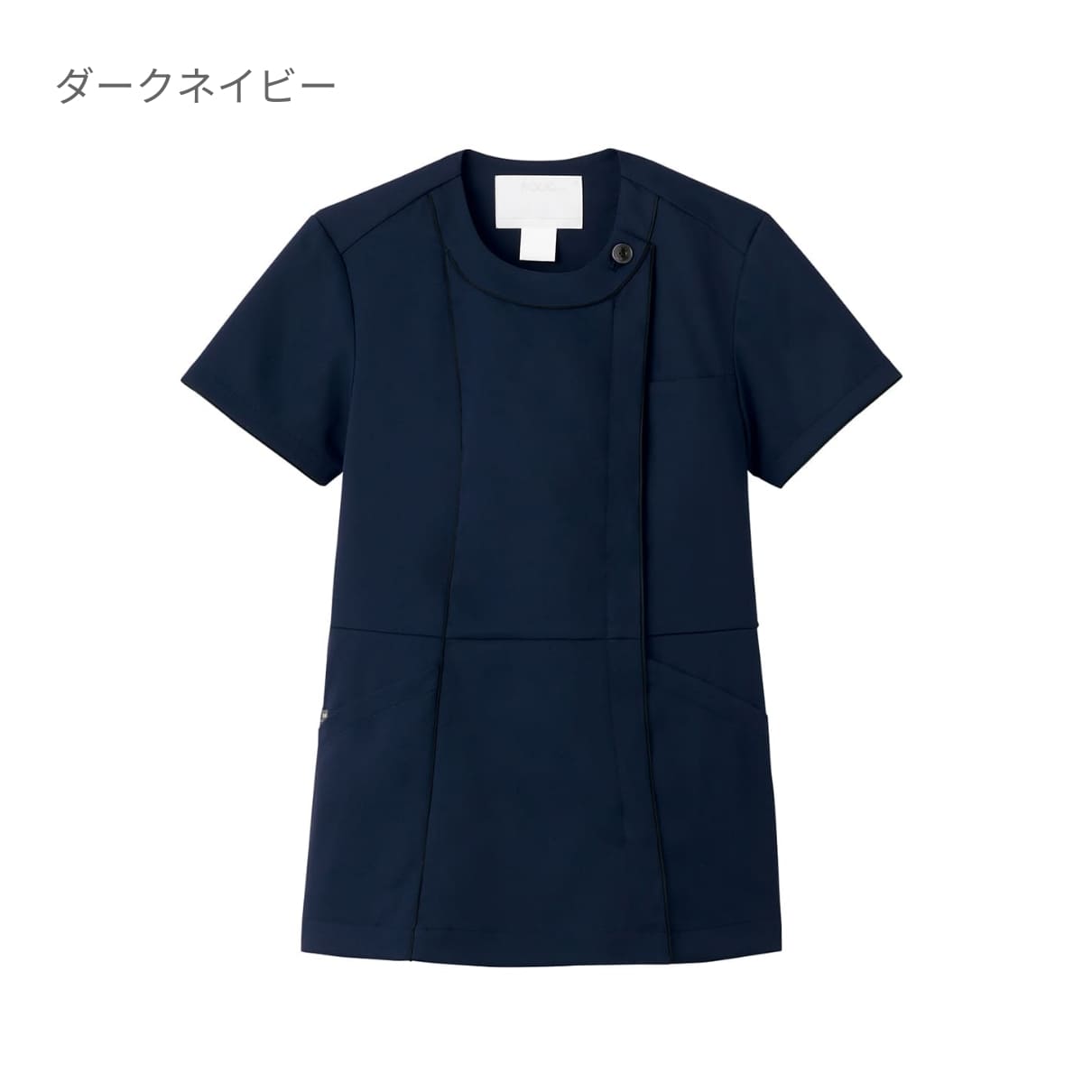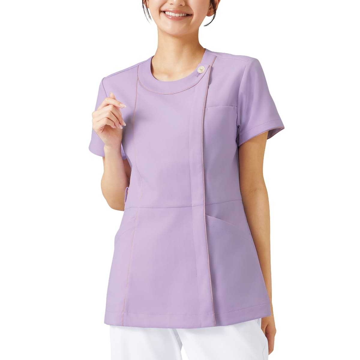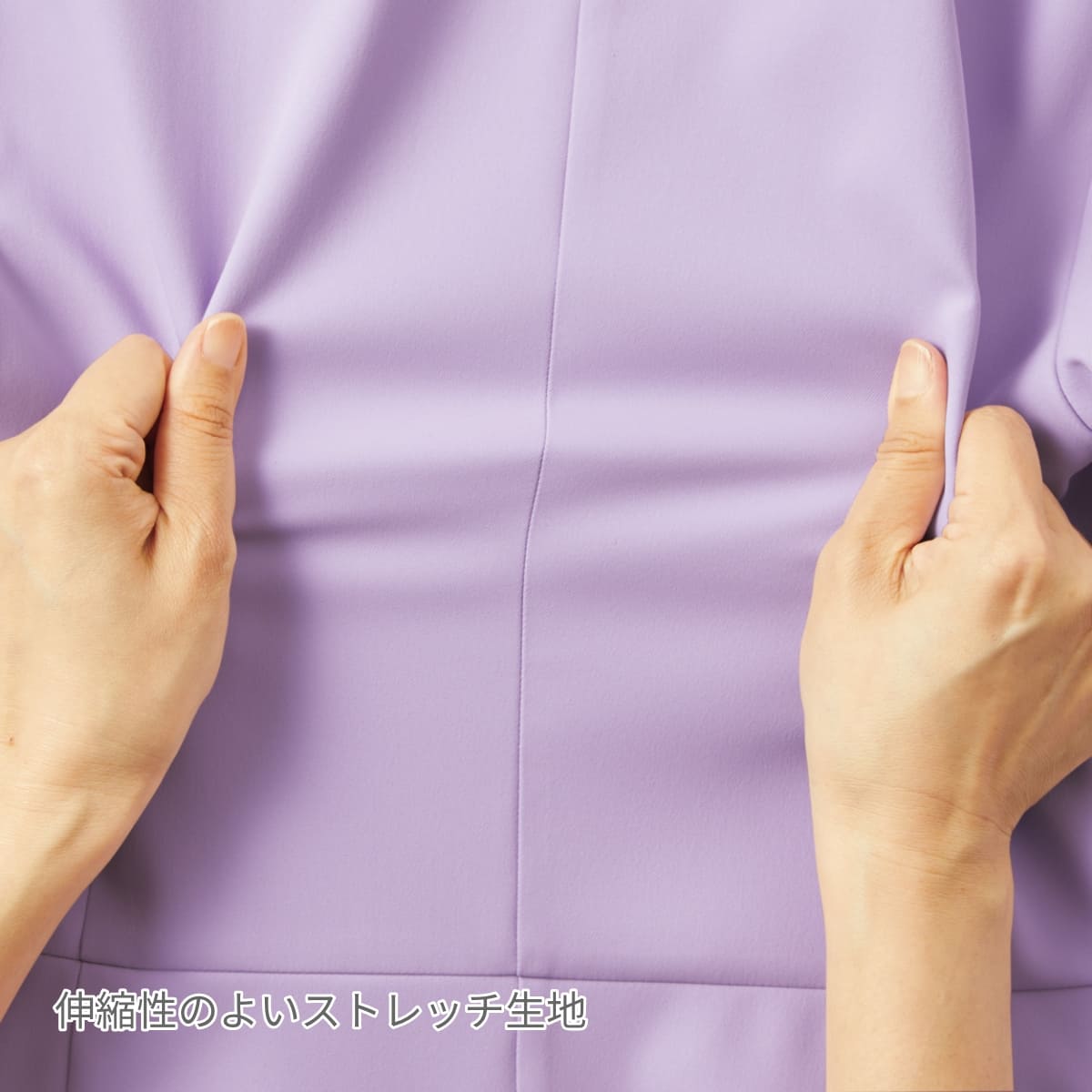 やわらかな印象のニュアンスカラーが新鮮で、配色トリミングがアクセントになっています。光沢のある上品な貝調釦も顔まわりにあることで華やかさをプラス。幅広い職種や年齢の方に着用いただけるデザインとカラー展開ですが、特に受付などのおもてなしの仕事や美容クリニックなどにおすすめ。羽織って着られる前ファスナー仕様とストレッチ素材で快適な着心地のレディースジップスクラブです。