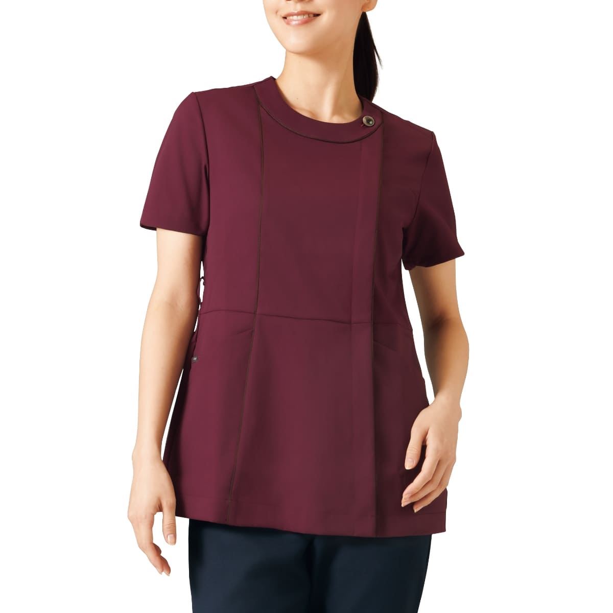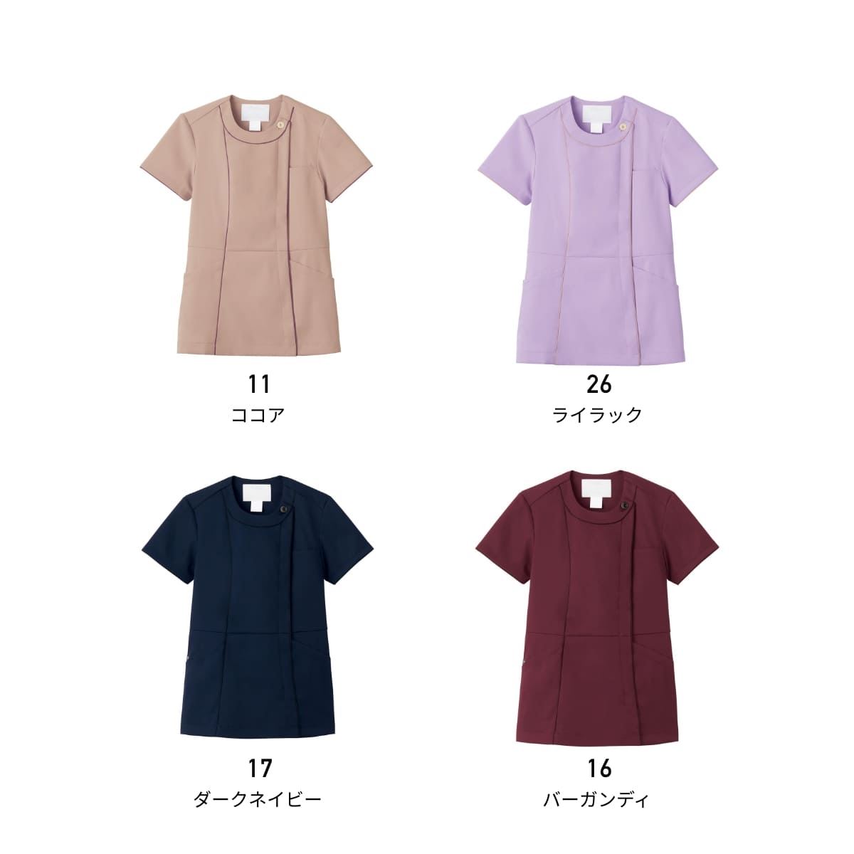 やわらかな印象のニュアンスカラーが新鮮で、配色トリミングがアクセントになっています。光沢のある上品な貝調釦も顔まわりにあることで華やかさをプラス。幅広い職種や年齢の方に着用いただけるデザインとカラー展開ですが、特に受付などのおもてなしの仕事や美容クリニックなどにおすすめ。羽織って着られる前ファスナー仕様とストレッチ素材で快適な着心地のレディースジップスクラブです。