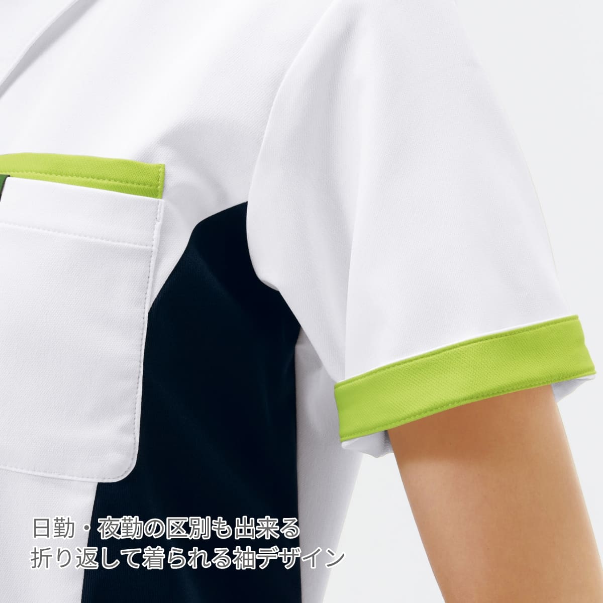 ライトフィックスは軽量で伸縮性があり、吸水速乾、制電機能も備えた素材です。襟付き仕様のため、首掛けストラップを使用する方にもおすすめ。また、羽織って着るジップタイプなので、着脱時に髪型が乱れたり、メイクが崩れる心配もなく安心。同素材のパンツ(5035SC)と合わせて着用することで、より快適に過ごしていただけます。