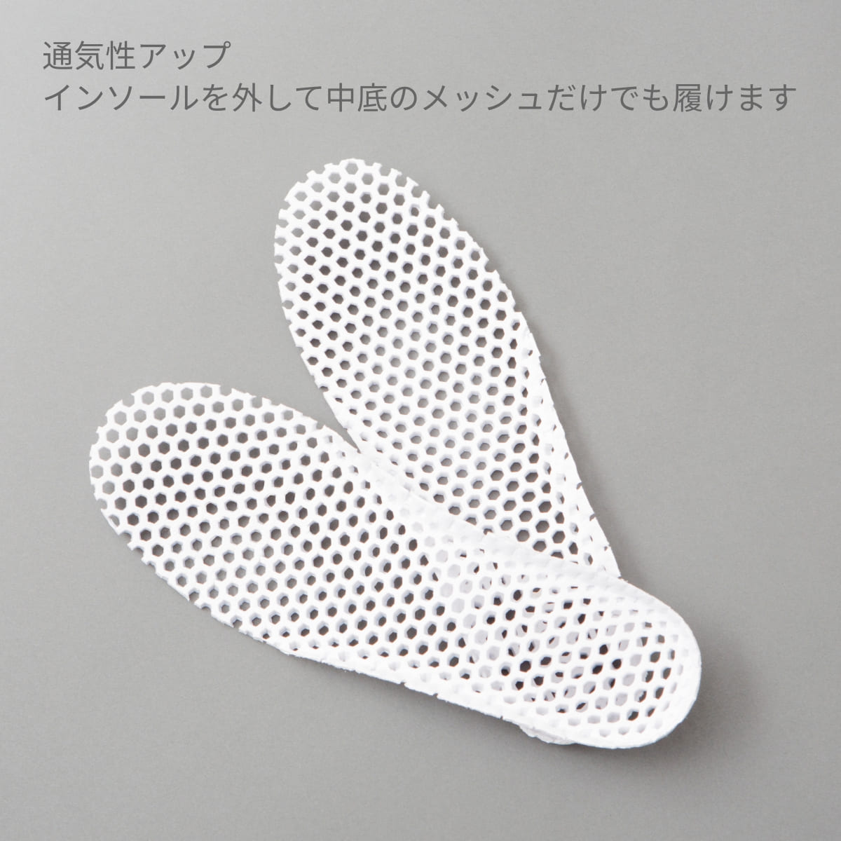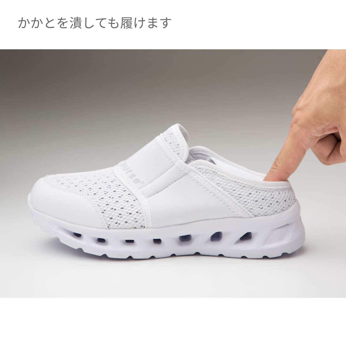 ぜひ風を感じるほどの通気性を体感してください。足のむくみやすい夕方には、インソールを外して中底のメッシュだけでも履くことが可能。通気性は更にアップし、足にぴったりフィットしているのにムレにくいのが嬉しいポイント。優れたクッション性とやわらかさで毎日を快適にサポート。かかとを潰しても履ける、便利な2wayタイプのナースシューズです。