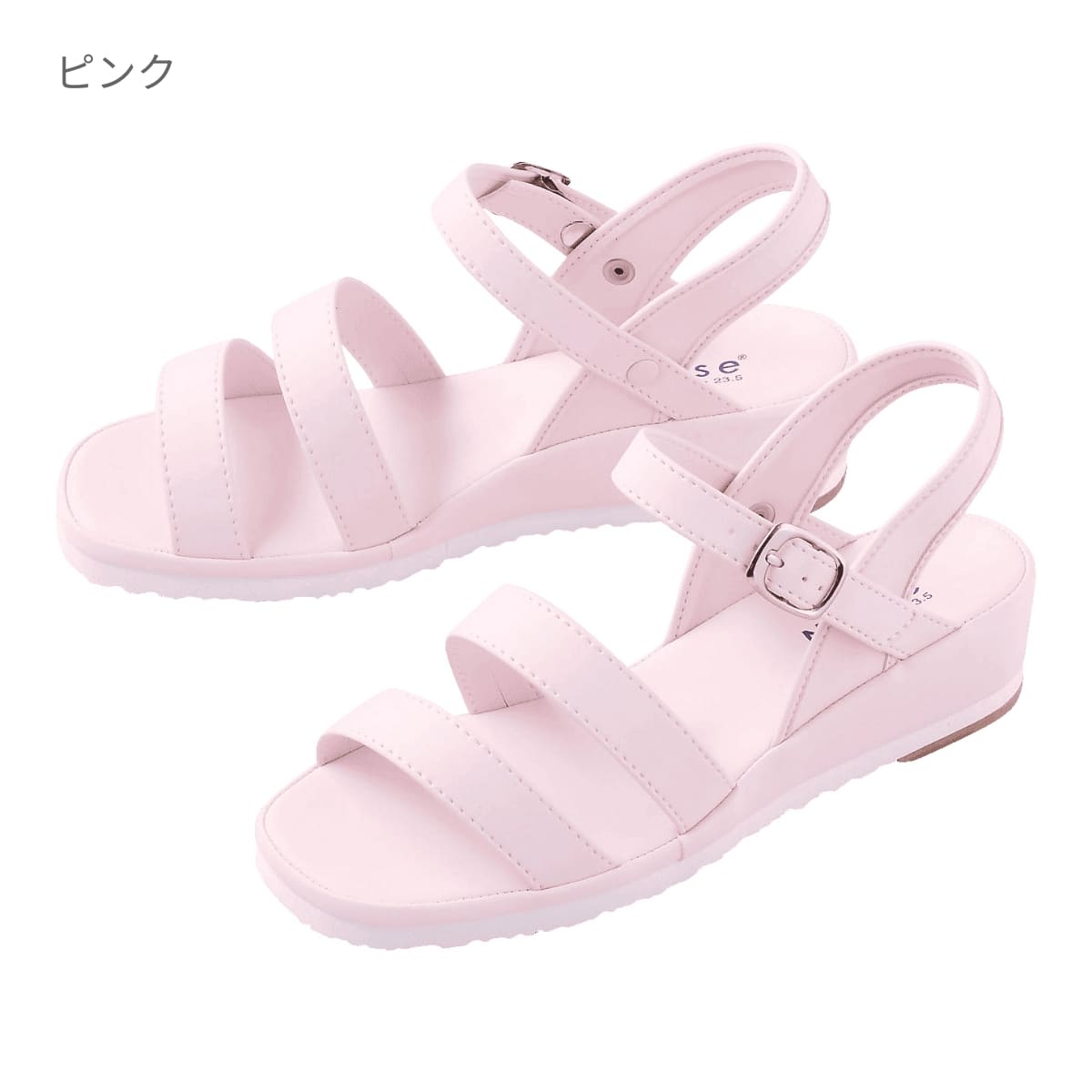 ヒールの高さは4cmと歩くのにちょうどいい高さ。サンダルタイプなので通気性も良く、ムレにくく快適です。抗菌防臭の加工付なので、長時間・長期間の使用でも安心。21~26cmまで豊富なサイズ展開で幅広い方が着用可能。疲れにくいゆったりとした履き心地で、しっかり足を固定してくれるので歩きやすい二本線サンダルです。