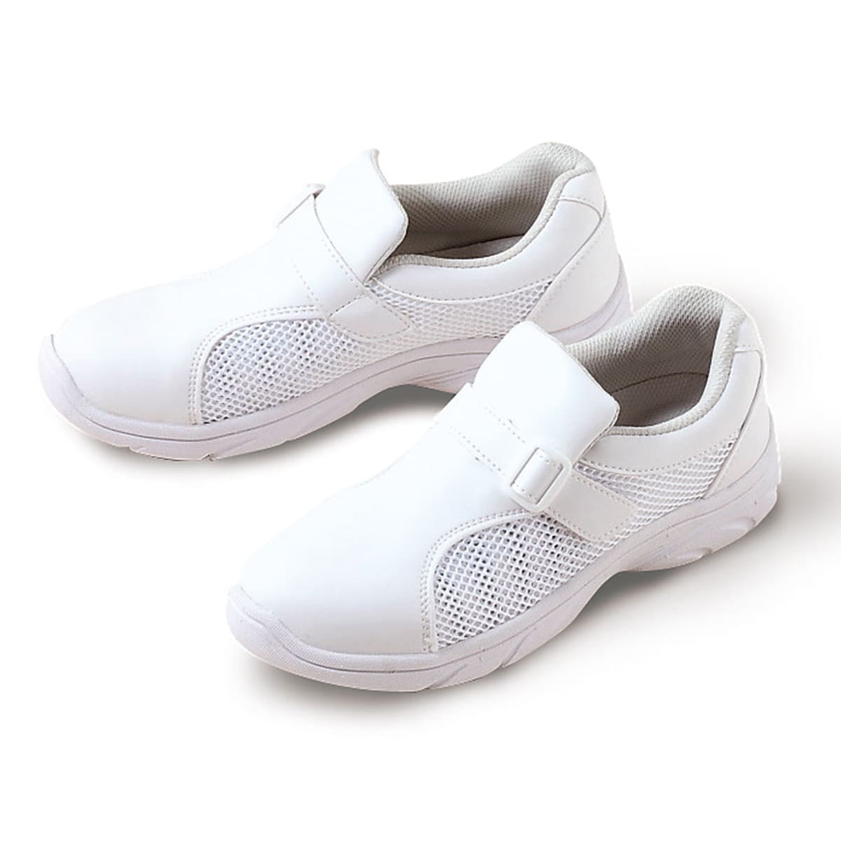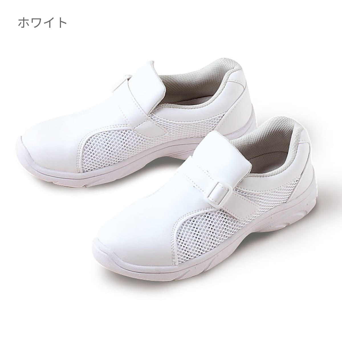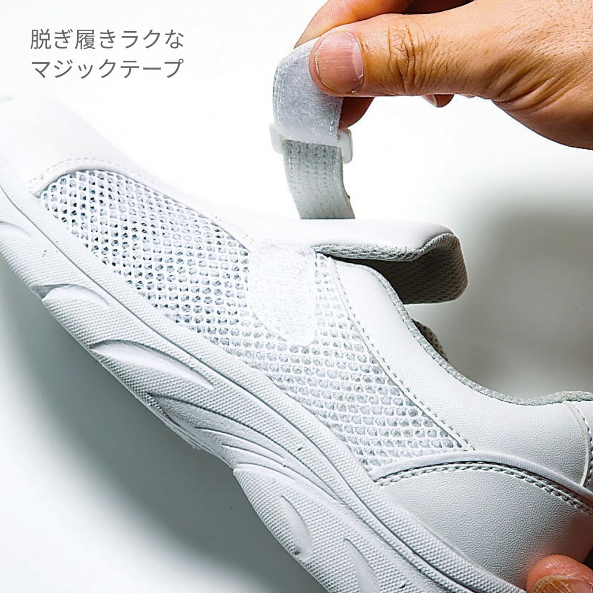 非常に軽く、しなやかに曲がるカップインソールを使用しているので、動きやすさ抜群です。脱ぎ履きがラクなマジックテープ仕様。ヒールの高さは3.5cmと歩きやすい高さに設計されているので一日中履いていても快適です。滑りにくく、軽い靴底を使用。靴のサイドにメッシュを取り入れることにより、通気性を良くし、ムレるのを防いでくれるので、不快感なくご使用いただける、男女兼用シューズです。