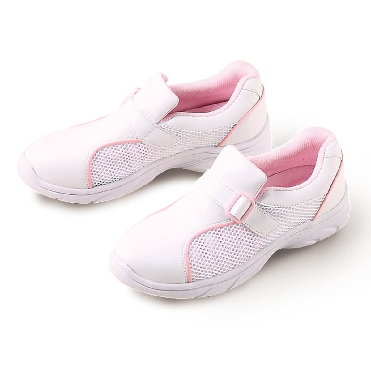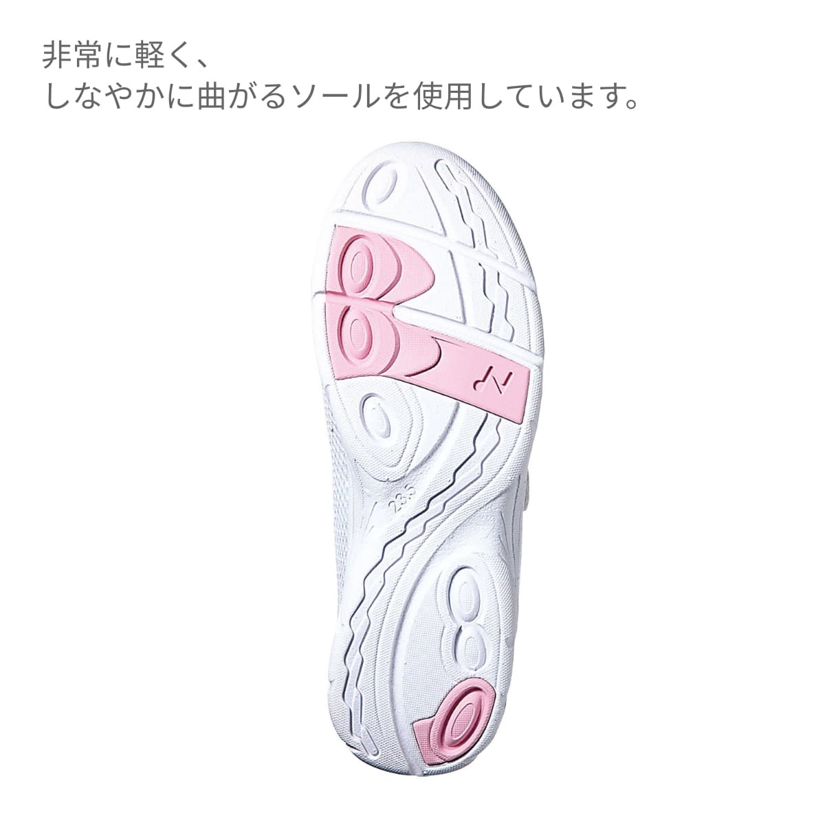 非常に軽く、しなやかに曲がるカップインソールを使用しているので、動きやすさ抜群です。脱ぎ履きがラクなマジックテープ仕様。ヒールの高さは3.5cmと歩きやすい高さに設計されているので一日中履いていても快適です。滑りにくく、軽い靴底を使用。靴のサイドにメッシュを取り入れることにより、通気性を良くし、ムレるのを防いでくれるので、不快感なくご使用いただける、男女兼用シューズです。