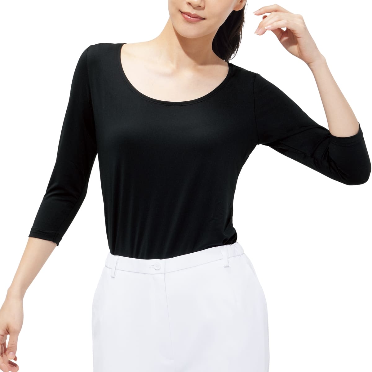 程よいゆとりが空気層を作り、動きやすく、長めの着丈でお腹まわりの冷え対策も万全です。どのスクラブと併せても襟元からインナーが見えてしまうことがない幅広設計で、着脱しやすい襟ぐりに。手洗い頻度の多い医療現場の声から生まれた、程よいフィット感と7.5分袖と短めの袖丈は作業時にも邪魔になることがなく快適です。スクラブ一枚では少し寒さを感じる方やあまり腕を見せたくない方などにオススメなスクラブ専用レディースインナーです。