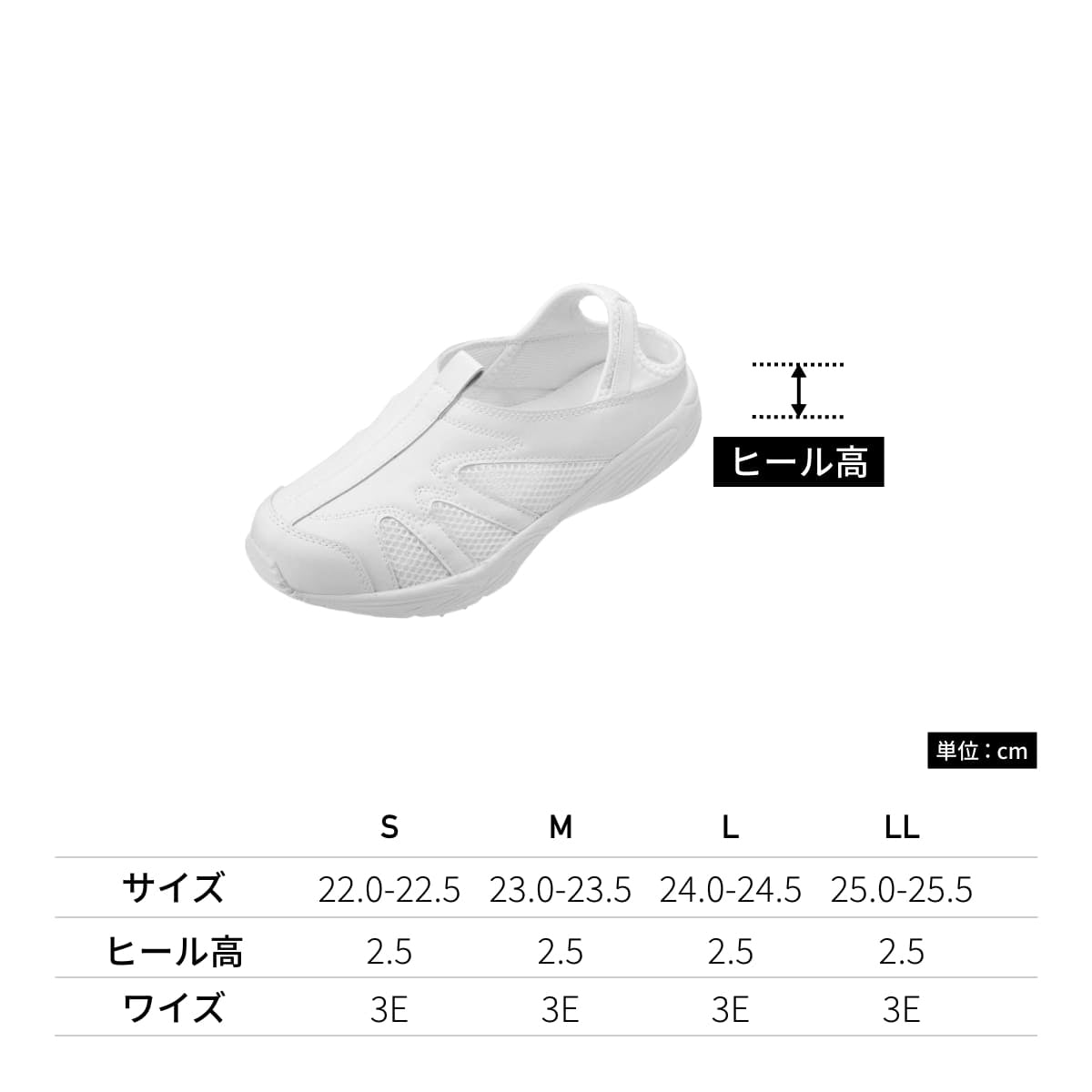 超軽量で足元軽やか、疲れにくいのが魅力。ヒールの高さは2.5cmと低めの歩きやすい高さに。サイズは22cmから25.5cm相当になるSからLLまでと幅広いサイズを取り揃えております。サイド部分はメッシュで通気性アップ。足がムレる心配がありません。ストレッチ素材で着脱カンタンなレディースサイドメッシュナースクロッグシューズです。