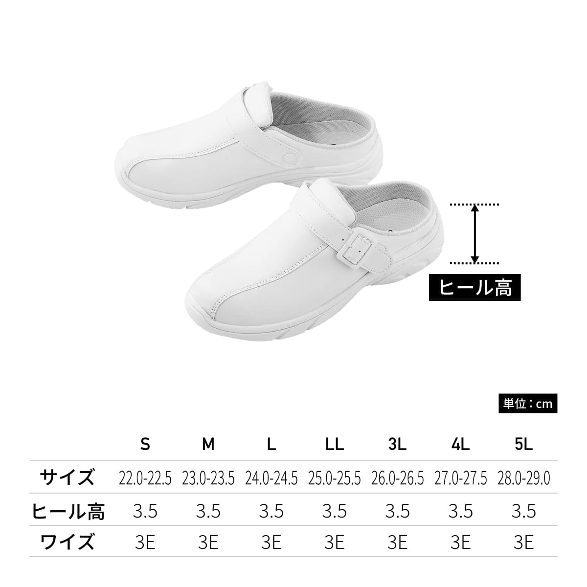 靴底には耐久性の高い素材を使用。パンツスタイルの方が履くと、かかと部分が隠れるので、まるで普通のスニーカーを履いているように見えます。看護師さんをはじめ、脱ぎ履ぎが多い方におすすめ。中敷は抗菌防臭加工のあるカップインソール。ヒールの高さは3.5cmと歩きやすい高さに。男女兼用で履くことができる男女兼用スリッポンです。