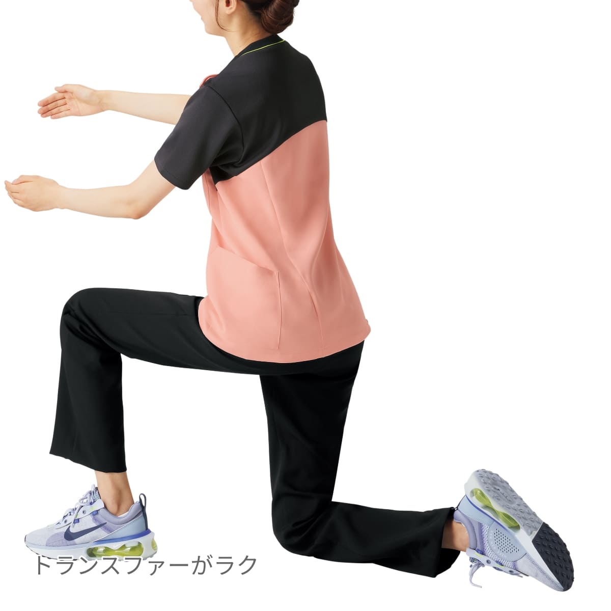 動きや持ち物の多いOT・PT向けに開発されたスクラブで、トランスファー(抱きかかえの動作)など、一番大きく動く部分に伸縮性の高いニットを施しました。また施術中の暑さ軽減のため、袖から背中にかけて通気性の良いブリースニットを採用したことで、快適に過ごすことができます。後ろ裾ファスナーは、着用時に開けることで着脱が楽チンになり、また開けて施術することで、ものを入れたまましゃがんでも突っ張ることがなく動きやすく、ウエストポーチ着用時は、裾がめくれることなく物が取り出しやすいです。インナーが見えないよう襟ぐりはリブ素材で肌当たりもよく安心。優しいカラー展開で院内を明るく、患者さんの気持ちも癒してくれる、機能性抜群のジップアップスクラブです。