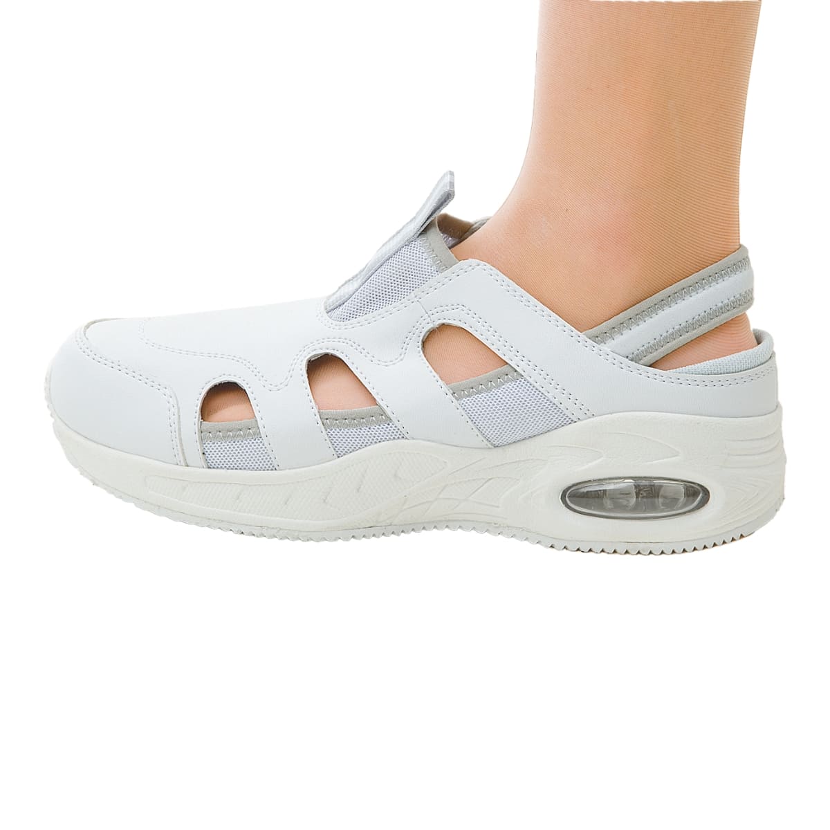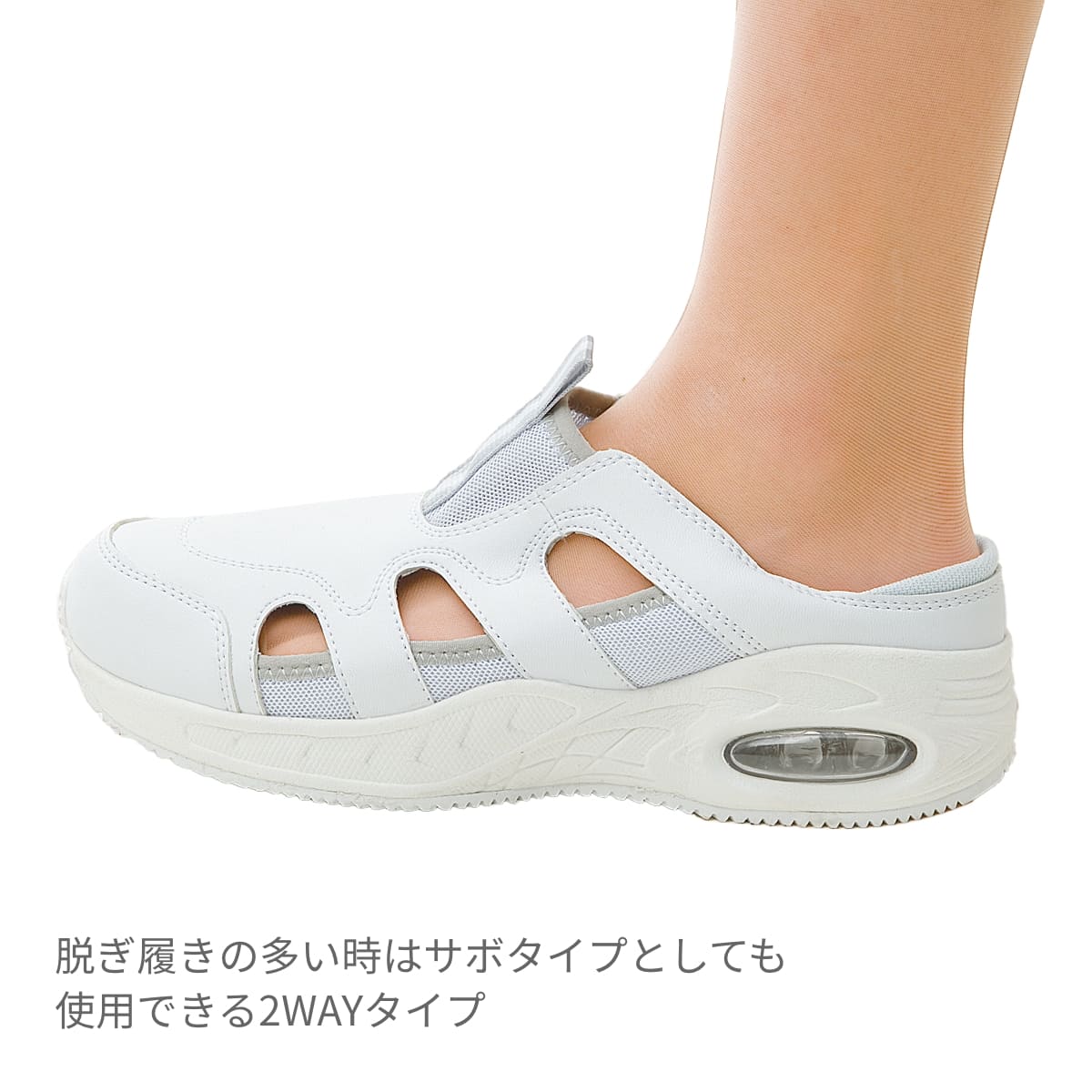 カップインソール、ミッドインソール、静電気帯電防止ゴムと3層設計になっているので、制電性も抜群です。抗菌防臭機能で長時間の使用も安心。エアークッション内蔵で歩きやすく疲れにくい設計になっています。脱ぎ履きの多い時にはバックバンドを踏んでサボタイプとしてご使用いただける便利な2wayタイプ。男女兼用で幅広いサイズ展開のナースシューズです。