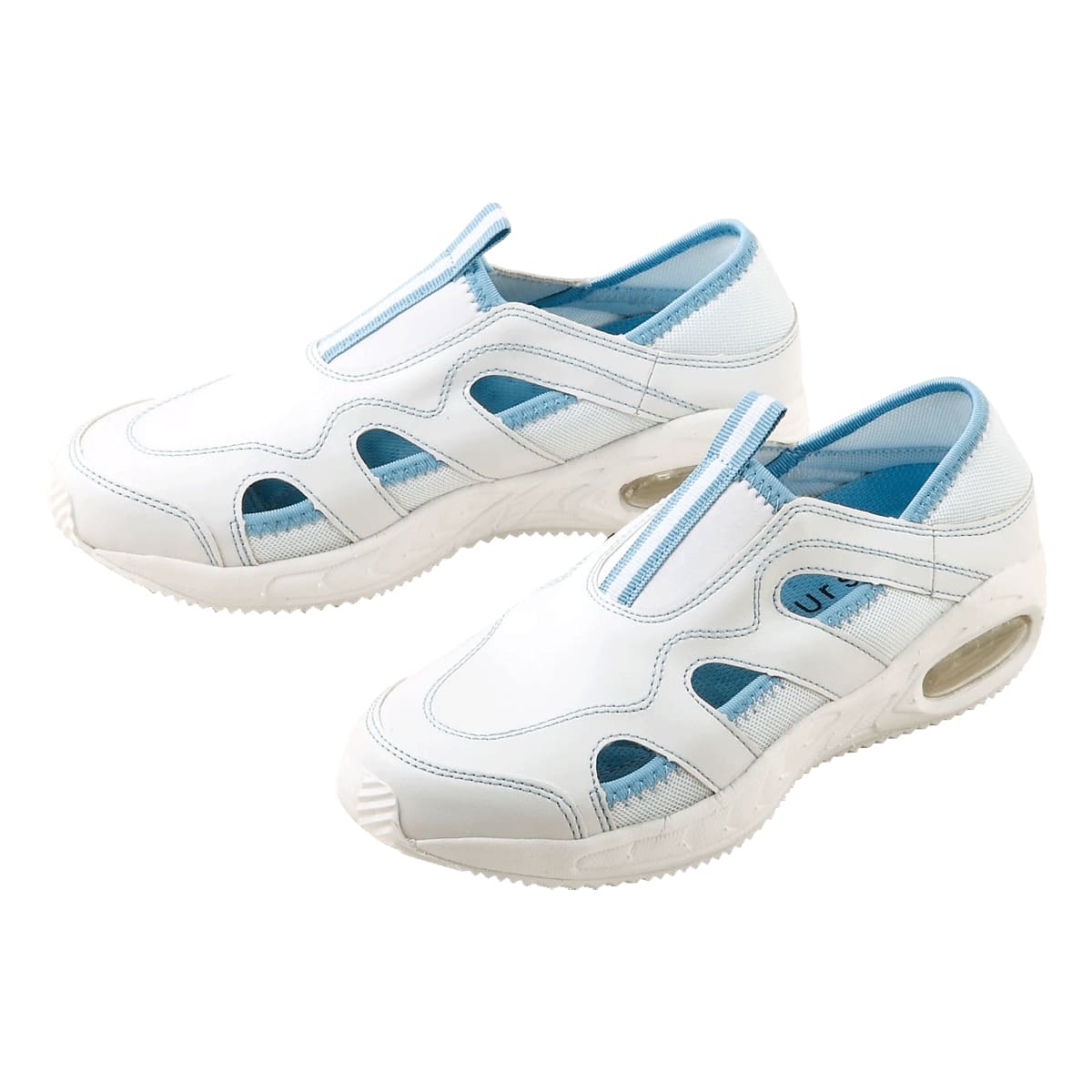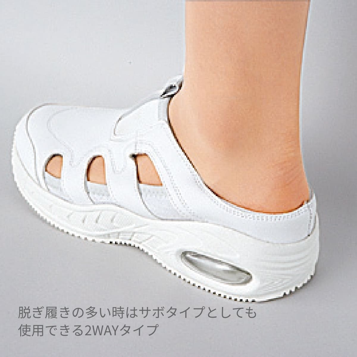 脱ぎ履ぎの多い時はサボタイプとしても使用できる便利な2wayタイプです。静電気帯電防止や抗菌防臭、エアバッグ内蔵とたくさんの便利な機能が備わったシューズ。中敷きの抗菌・防臭加工で、お仕事中の気になる臭いも軽減してくれます。足にジャストフィットするストレッチ素材なので、疲れにくい設計に。通気性をはじめとした機能性抜群の男女兼用ナースシューズです。