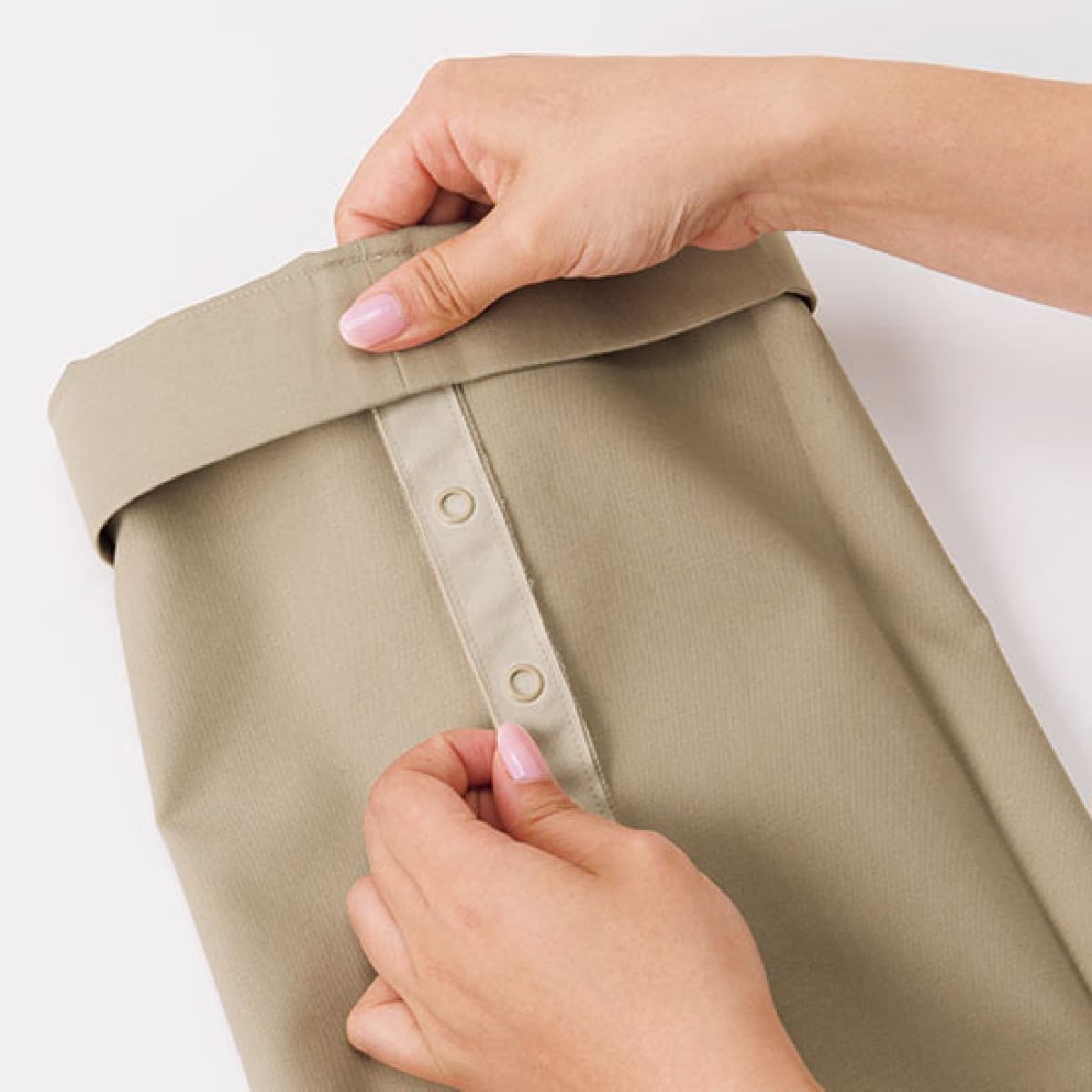 手間と時間のかかる通常の裾上げとは違い、ワンタッチのスナップホックを閉じるだけで簡単に裾上げができます。