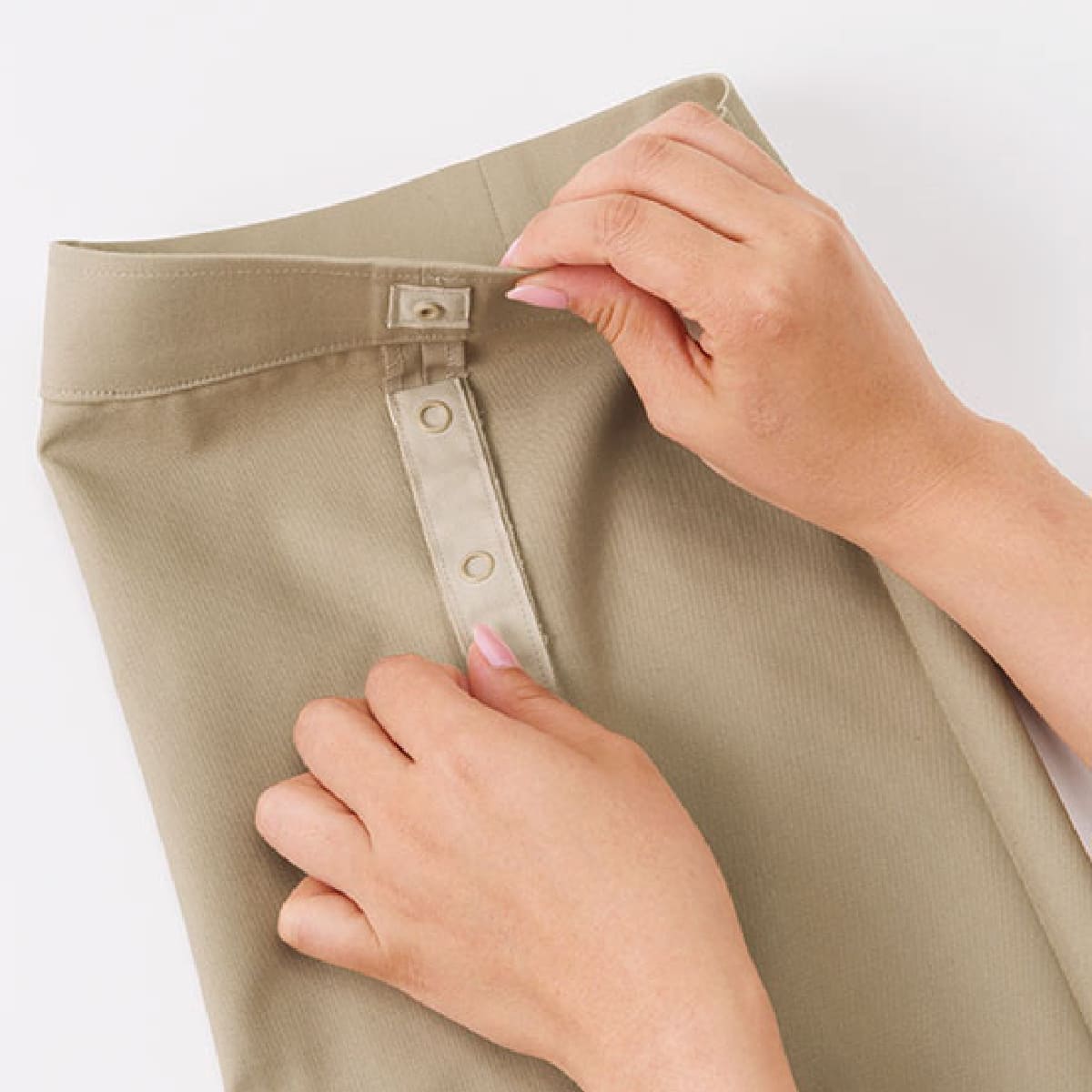 手間と時間のかかる通常の裾上げとは違い、ワンタッチのスナップホックを閉じるだけで簡単に裾上げができます。