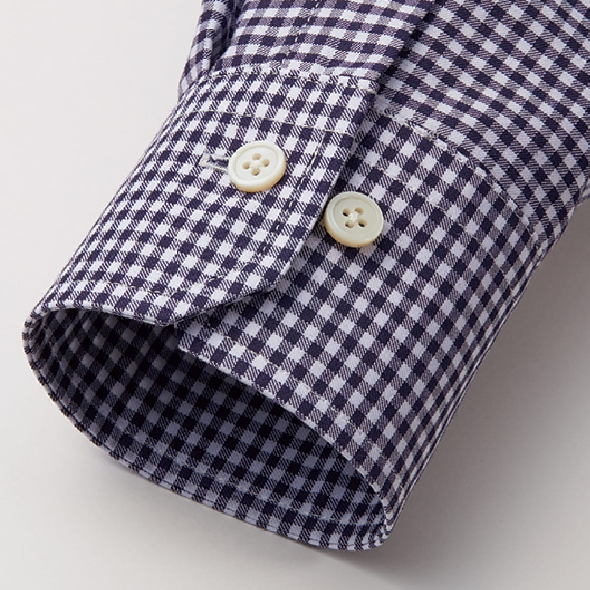 袖口のアジャストボタンと、角を落としたカフスデザインが特徴