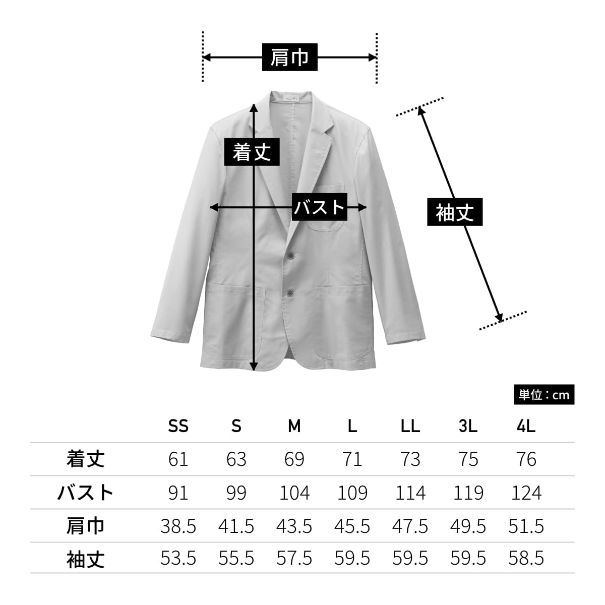 | 袖丈 | 53.5 | 55.5 | 57.5 | 59.5 | 59.5 | 59.5 | 58.5 |