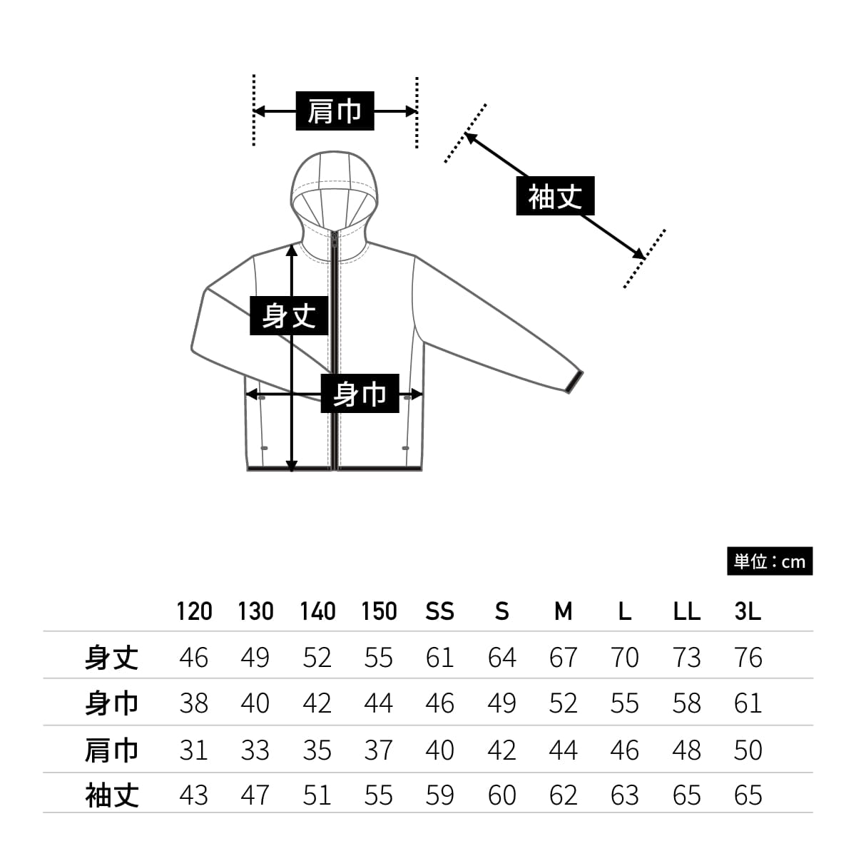 | 身丈 | 46 | 49 | 52 | 55 | 61 | 64 | 67 | 70 | 73 | 76 |