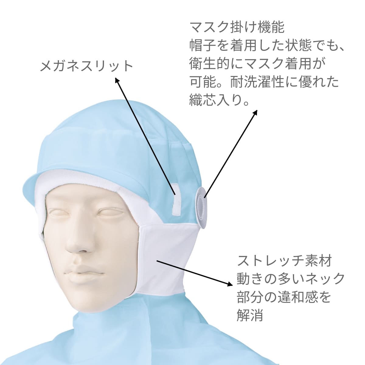 ・マスク掛け機能:織芯(帽子を着用した状態でも、衛生的にマスク着用が可能。耐洗濯性に優れた織芯入り。)