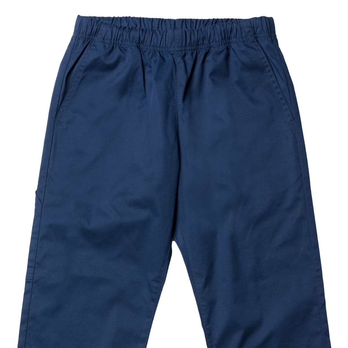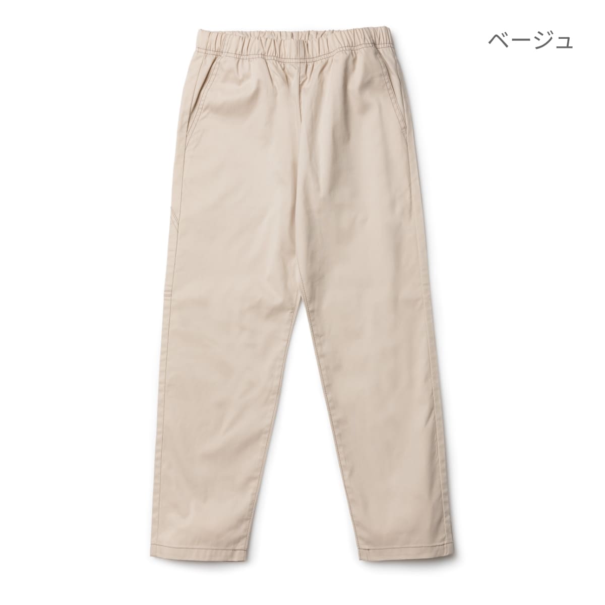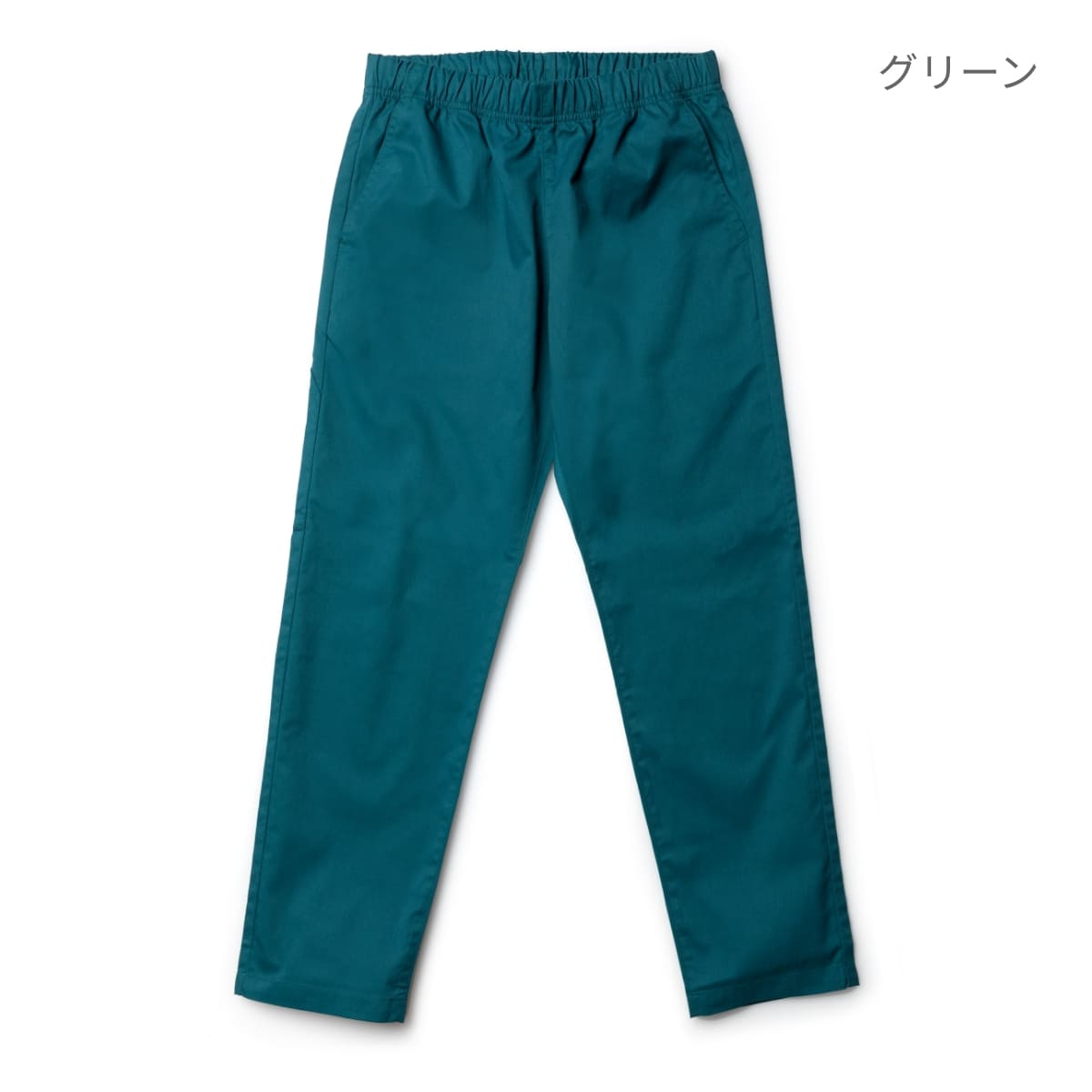 ウエストゴム、コード仕立てで屈伸時も動きやすいユニセックスパンツ。
