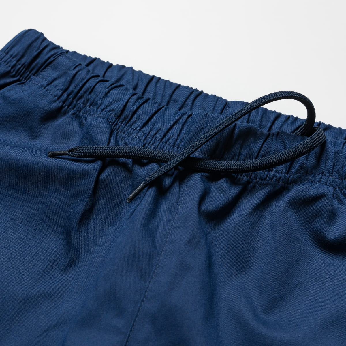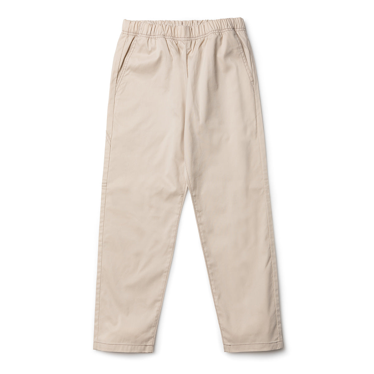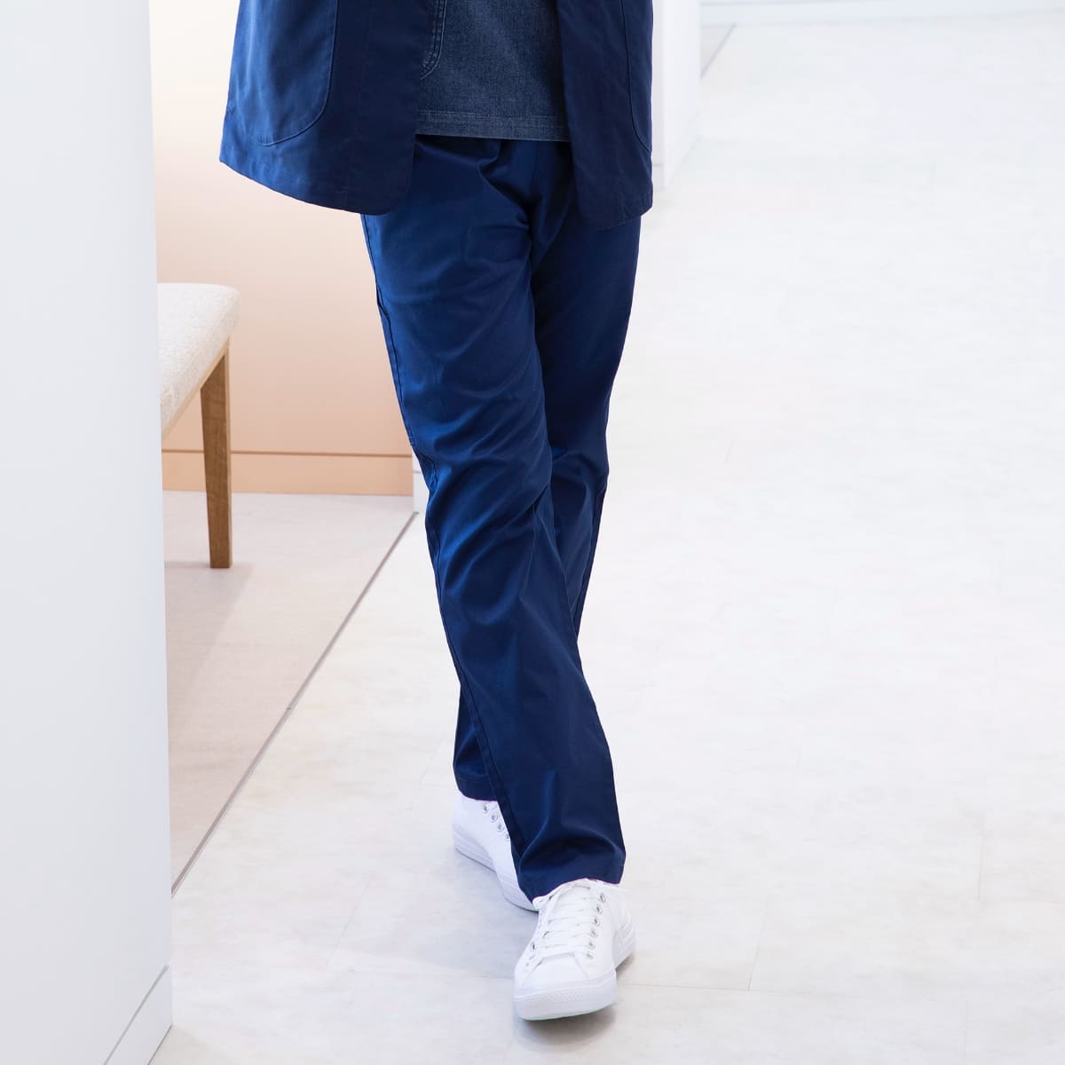 ウエストゴム、コード仕立てで屈伸時も動きやすいユニセックスパンツ。